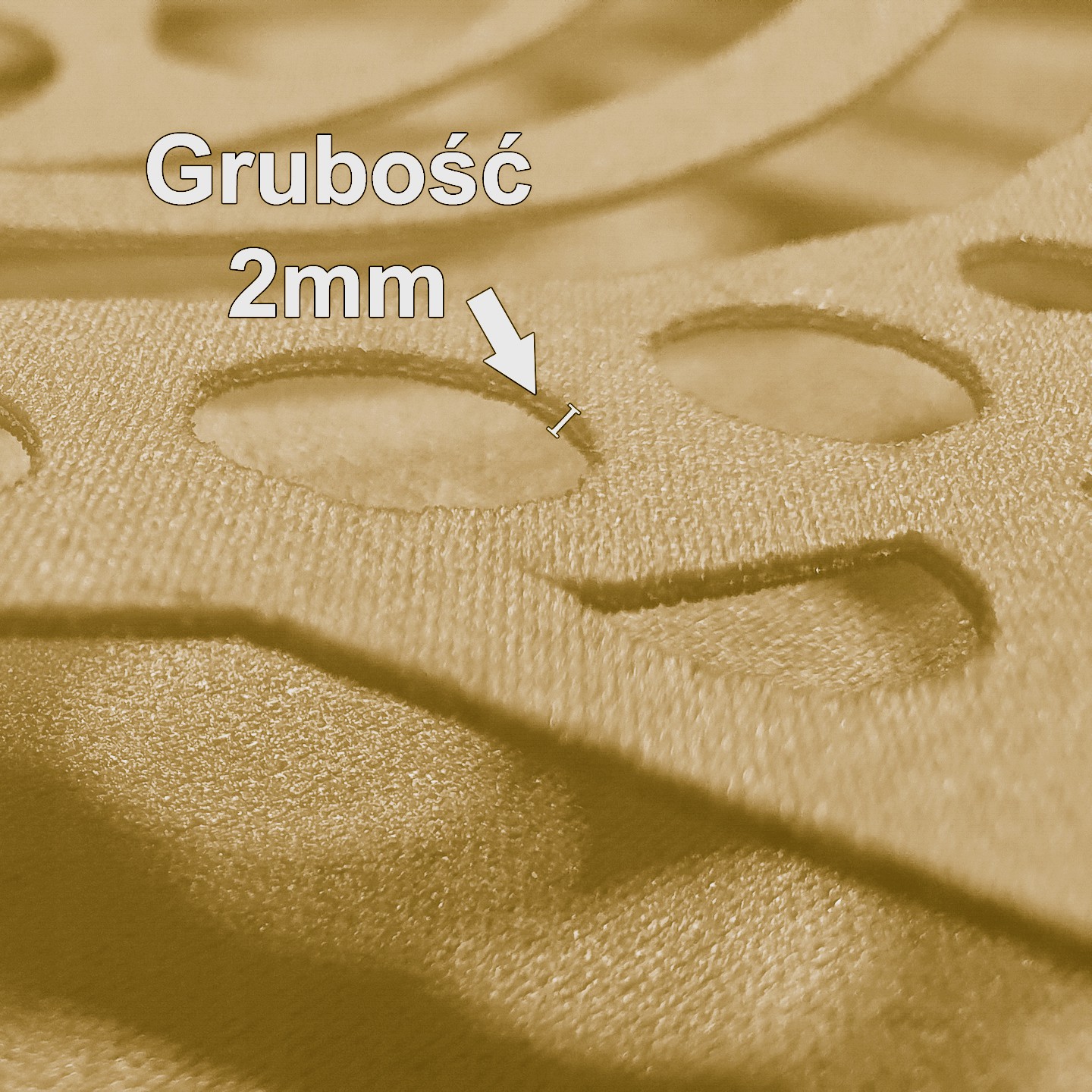 Ażury wykonane są metodą laserową ze sklejonej podwójnie tkaniny, usztywnionej od środka.
