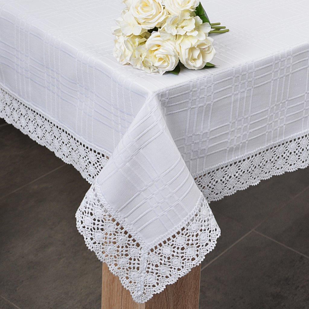Bieżnik Bawełniany z koronką to wyjątkowa kolekcja matowych obrusów wykończonych ozdobną koronką bawełnianą o szerokości 7 cm. Dekoracyjna koronka nadaje obrusowi eleganckiego szyku oraz wyjątkowego wyglądu .