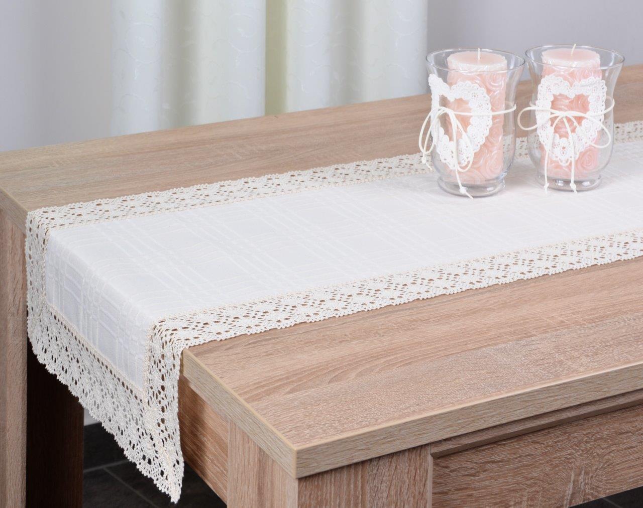 Bieżnik Bawełniany z koronką to wyjątkowa kolekcja matowych obrusów wykończonych ozdobną koronką bawełnianą o szerokości 7 cm. Dekoracyjna koronka nadaje obrusowi eleganckiego szyku oraz wyjątkowego wyglądu .