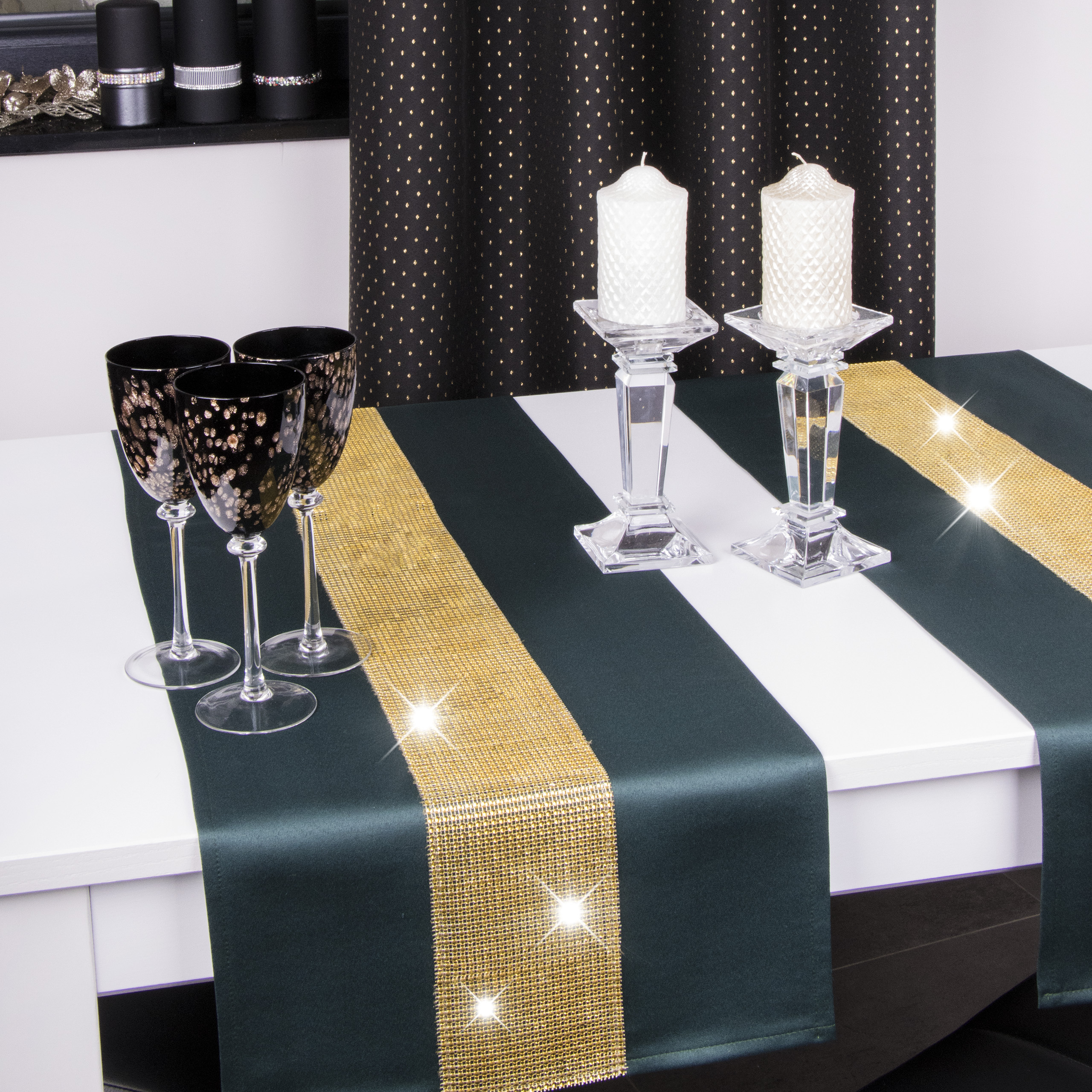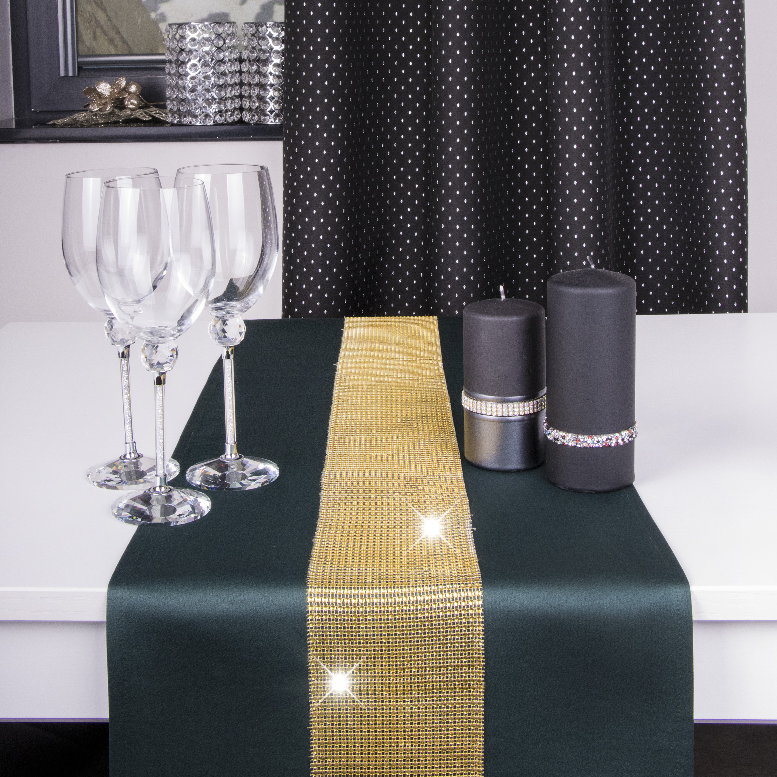 CYRKONIA to wyjątkowa kolekcja atłasowych nowoczesnych bieżników ozdobionych lśniącą listwą srebrnych lub złotych cyrkonii, która nadaje całości niezwykłej elegancji. Splot atłasowej tkaniny z której uszyte są bieżniki powoduje, że są one miękkie, lejące i elastyczne, a ponadto błyszczące i bardziej nasycone kolorem. Produkt jest w 100% plamoodporny, dzięki czemu odznacza się wysoką trwałością.