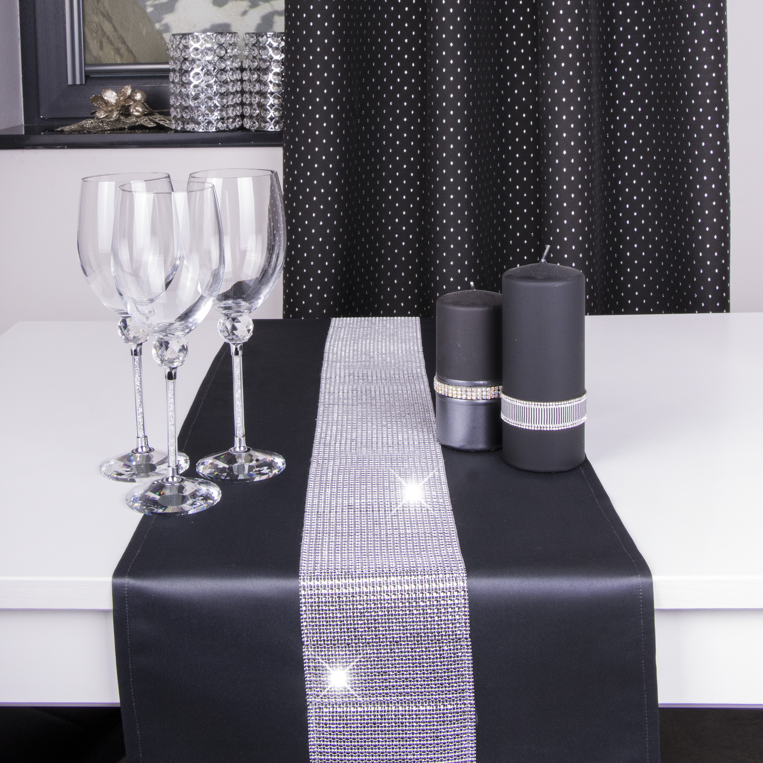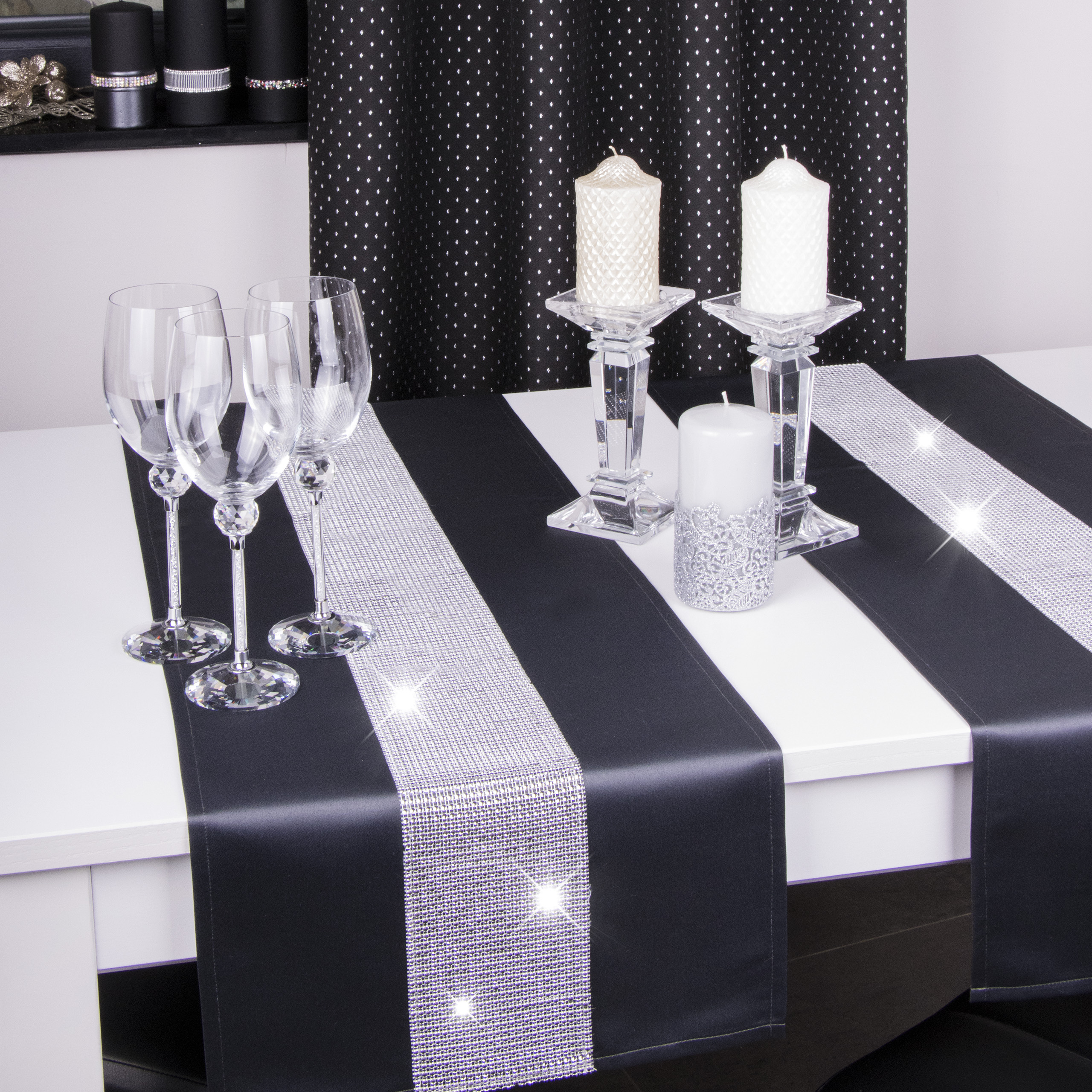 CYRKONIA to wyjątkowa kolekcja atłasowych bieżników ozdobionych lśniącą listwą srebrnych lub złotych cyrkonii, która nadaje całości niezwykłej elegancji. Splot atłasowej tkaniny z której uszyte są bieżniki powoduje, że są one miękkie, lejące i elastyczne, a ponadto błyszczące i bardziej nasycone kolorem. Produkt jest w 100% plamoodporny, dzięki czemu odznacza się wysoką trwałością.