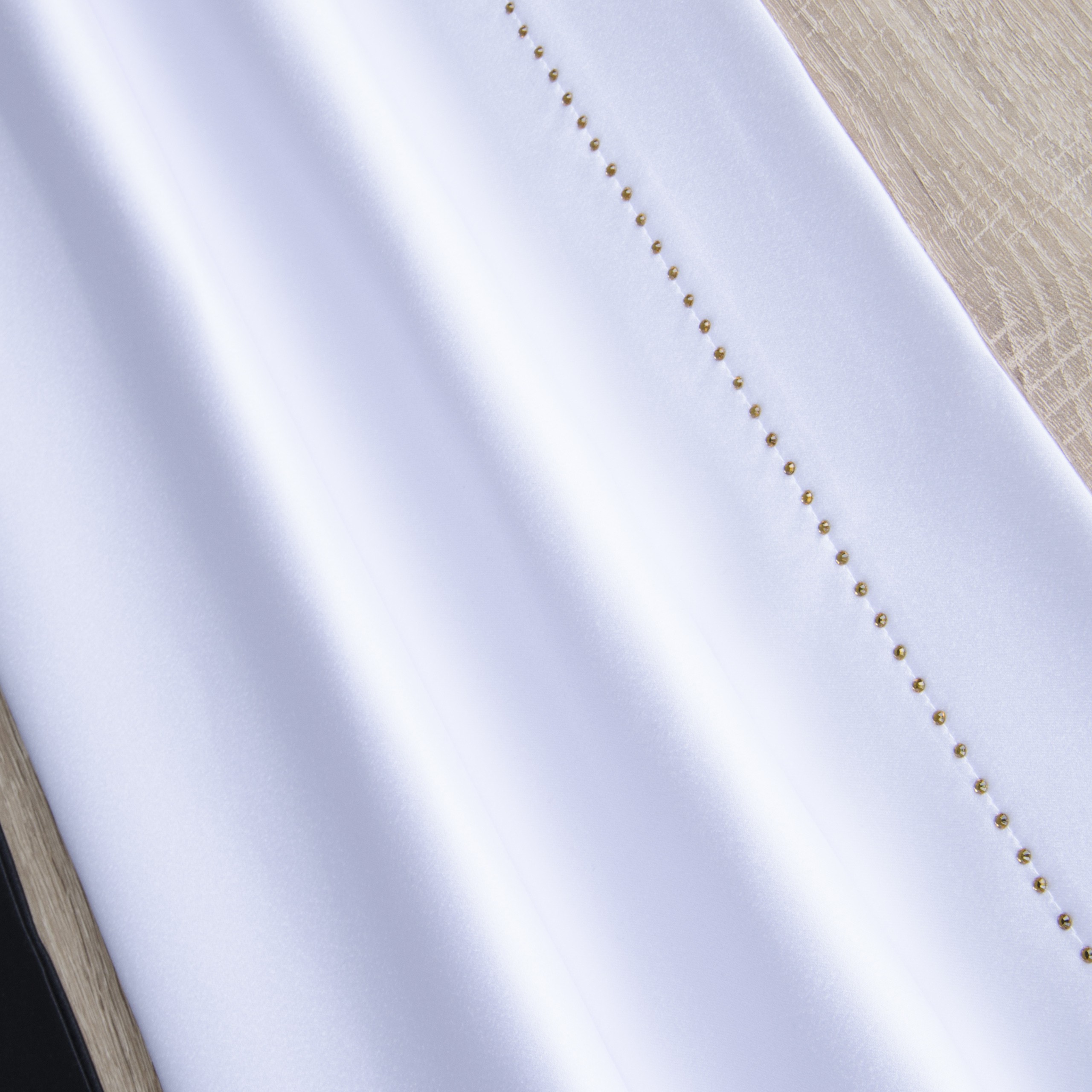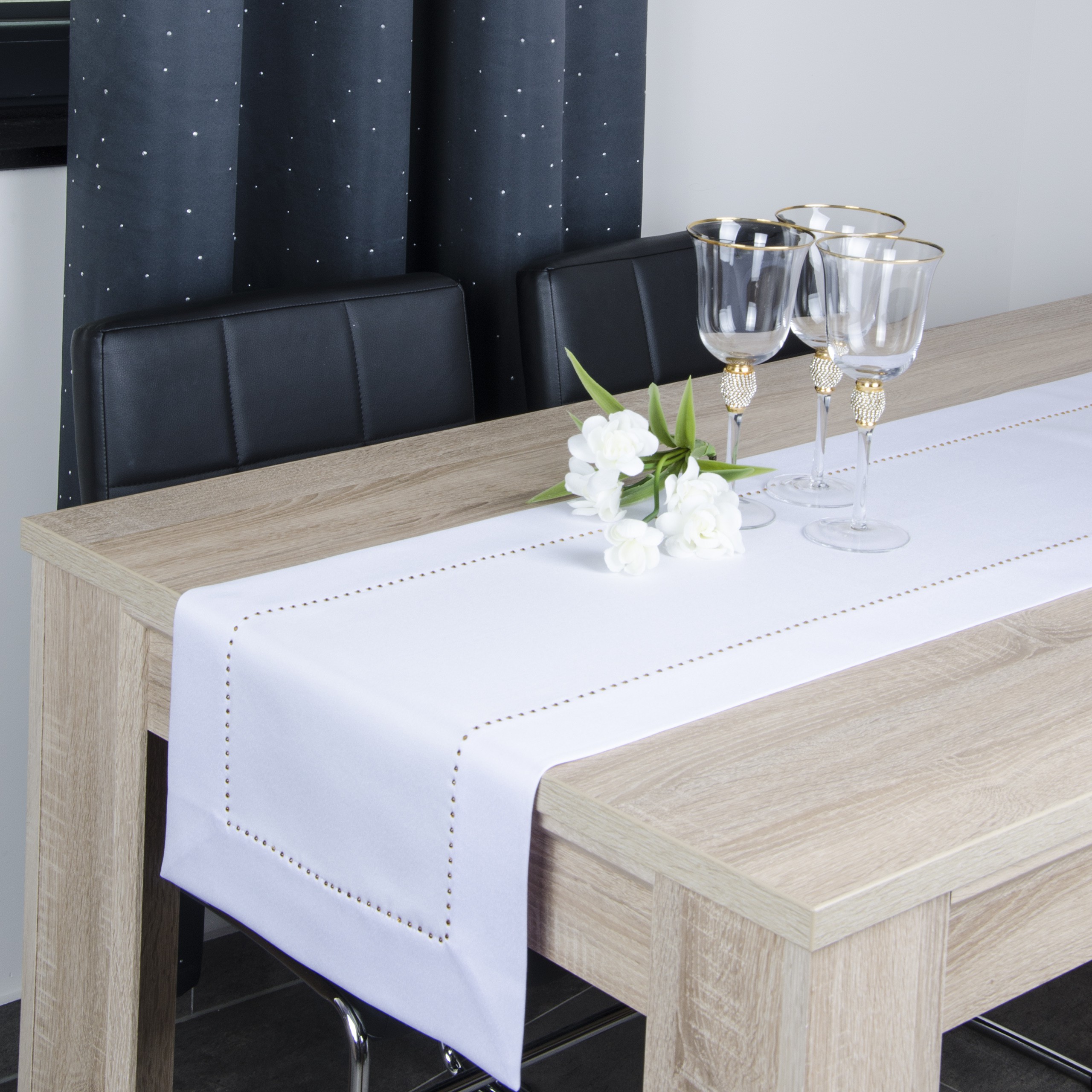 GLAMOUR to wyjątkowa kolekcja atłasowych obrusów wykończonych ozdobną listwą o szerokości 7 cm, wzdłuż obszycia ozdobione są nowoczesnym wzorem wykonanym z metalowych, srebrnych dżetów.