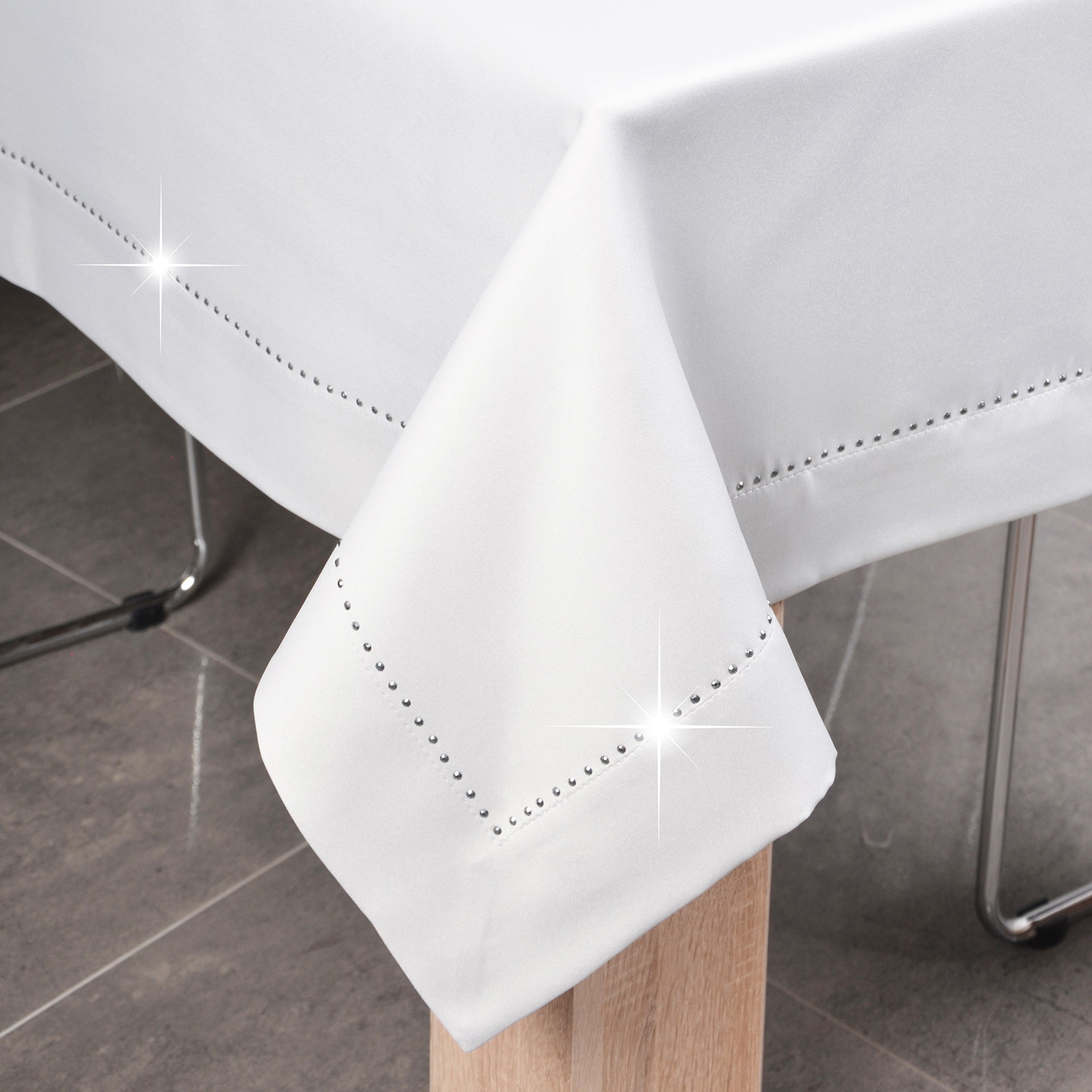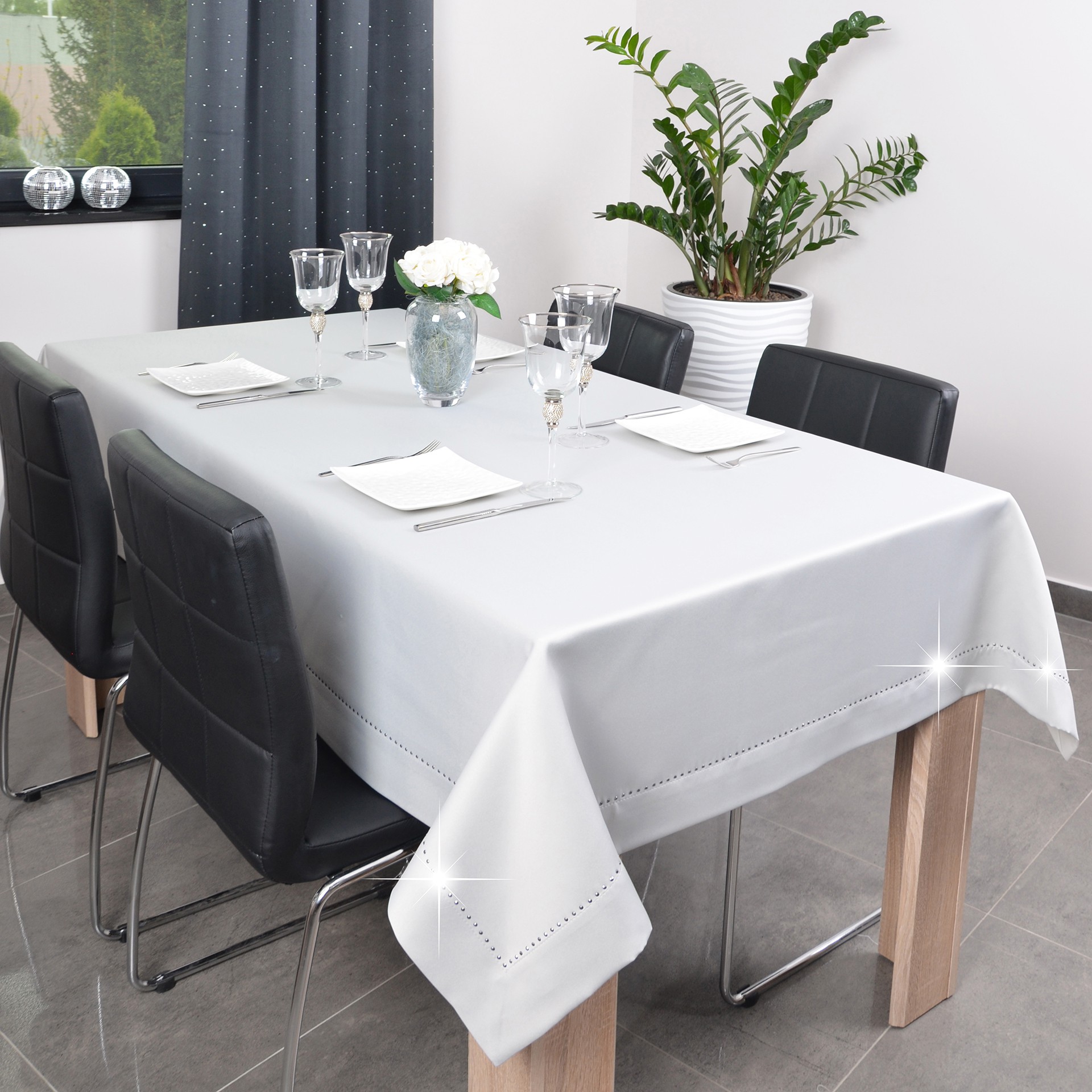 GLAMOUR to wyjątkowa kolekcja atłasowych obrusów wykończonych ozdobną listwą o szerokości 7 cm, wzdłuż obszycia ozdobione są nowoczesnym wzorem wykonanym z metalowych, srebrnych dżetów.