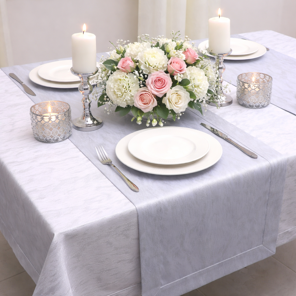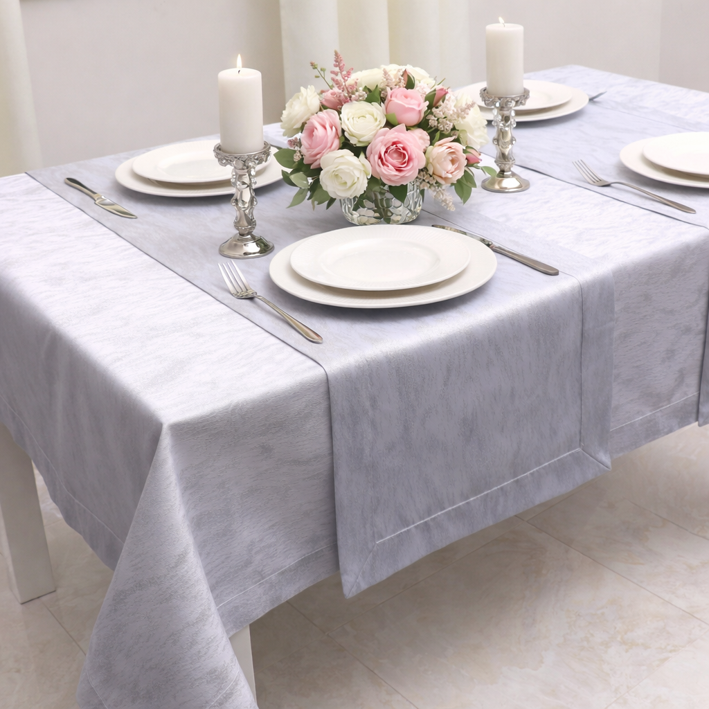 Obrus Srebrna Chmurka to wyjątkowa kolekcja żakardowych obrusów wykończonych listwą o szerokości 5 cm. Ten wyjątkowy obrus łączy ponadczasową klasykę z nutą luksusu. Wykonany z wysokiej jakości tkaniny ze srebrną , metalizowaną nitką, doskonale komponuje się z każdym wystrojem wnętrza, dodając mu subtelnej elegancji.