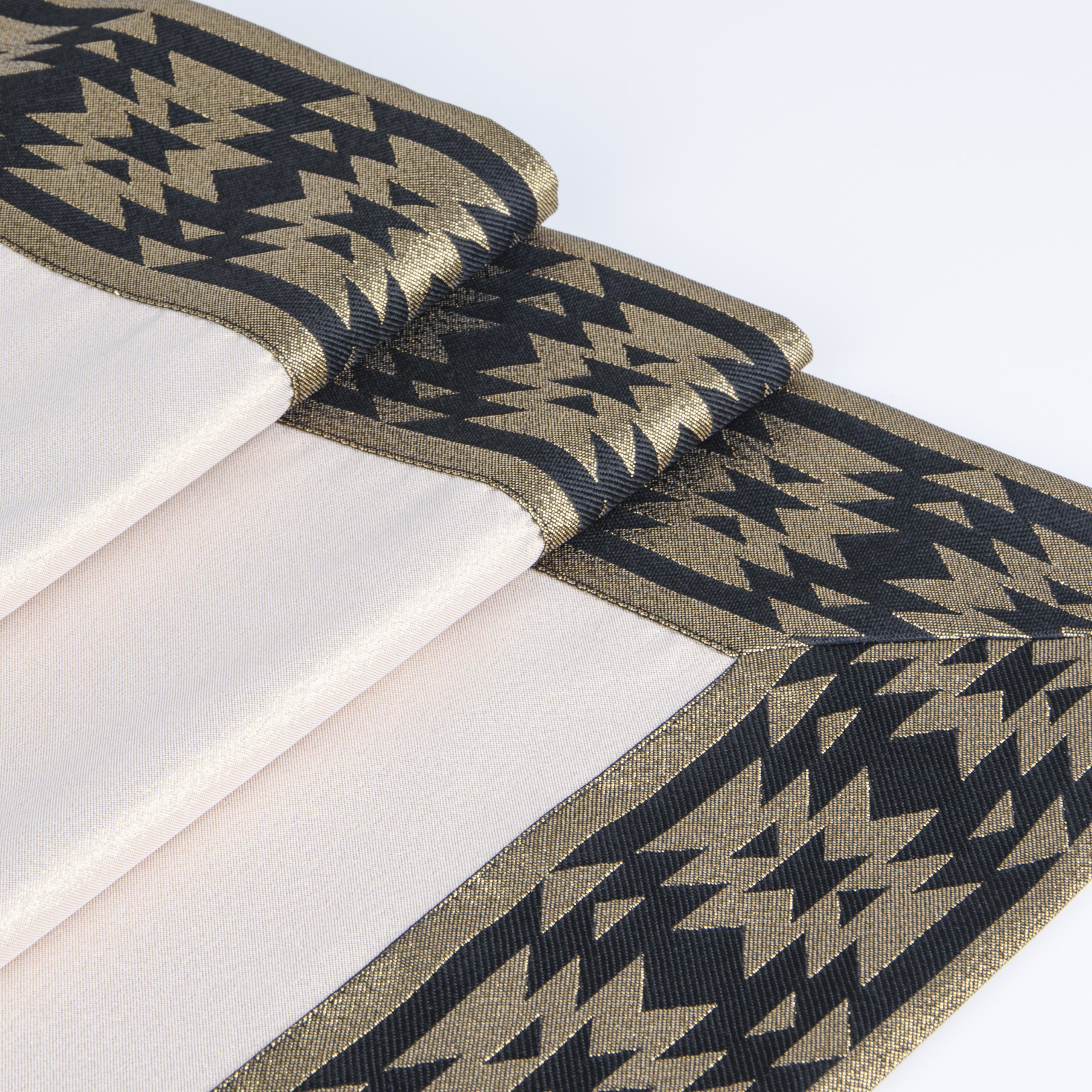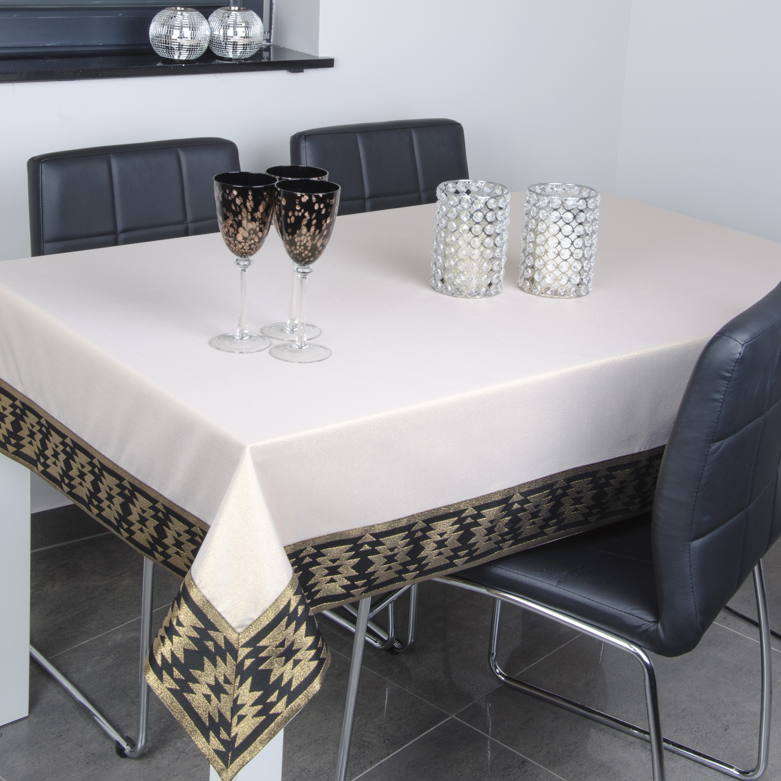 VEGA LUX BROKAT to wyjątkowa kolekcja atłasowych obrusów wykończonych ozdobną listwą o szerokości 10 cm, tkaną metalizowaną nitką w kolorze srebrnym lub złotym z oryginalnym wzorem azteckim.