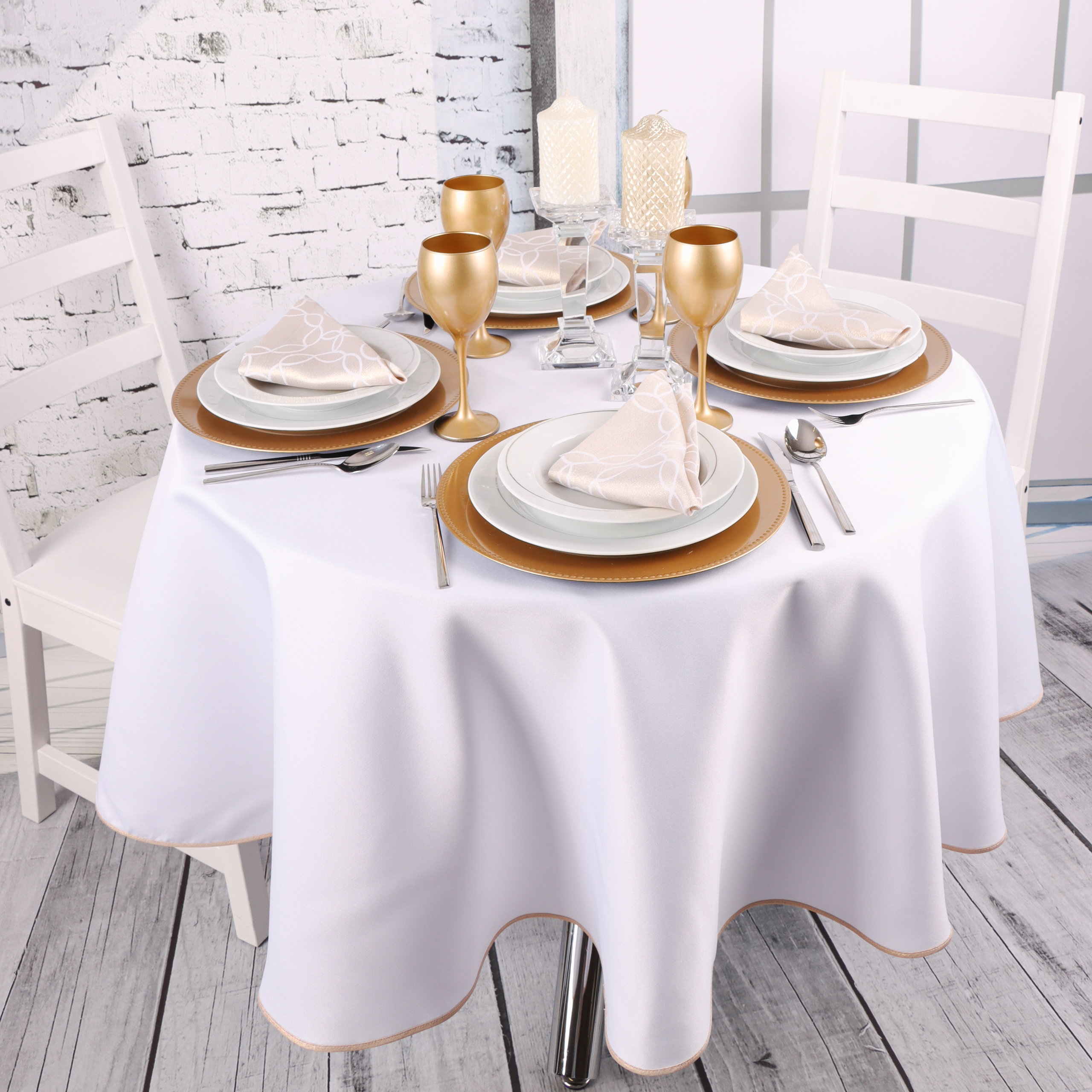 Okrągły obrus ze złotą lamówką – klasyka w nowoczesnym wydaniu, idealna zarówno na intymne kolacje, jak i wyjątkowe uroczystości. Ta subtelna kombinacja dodaje elegancji każdemu wnętrzu, sprawiając, że stół staje się centralnym punktem każdego wydarzenia.