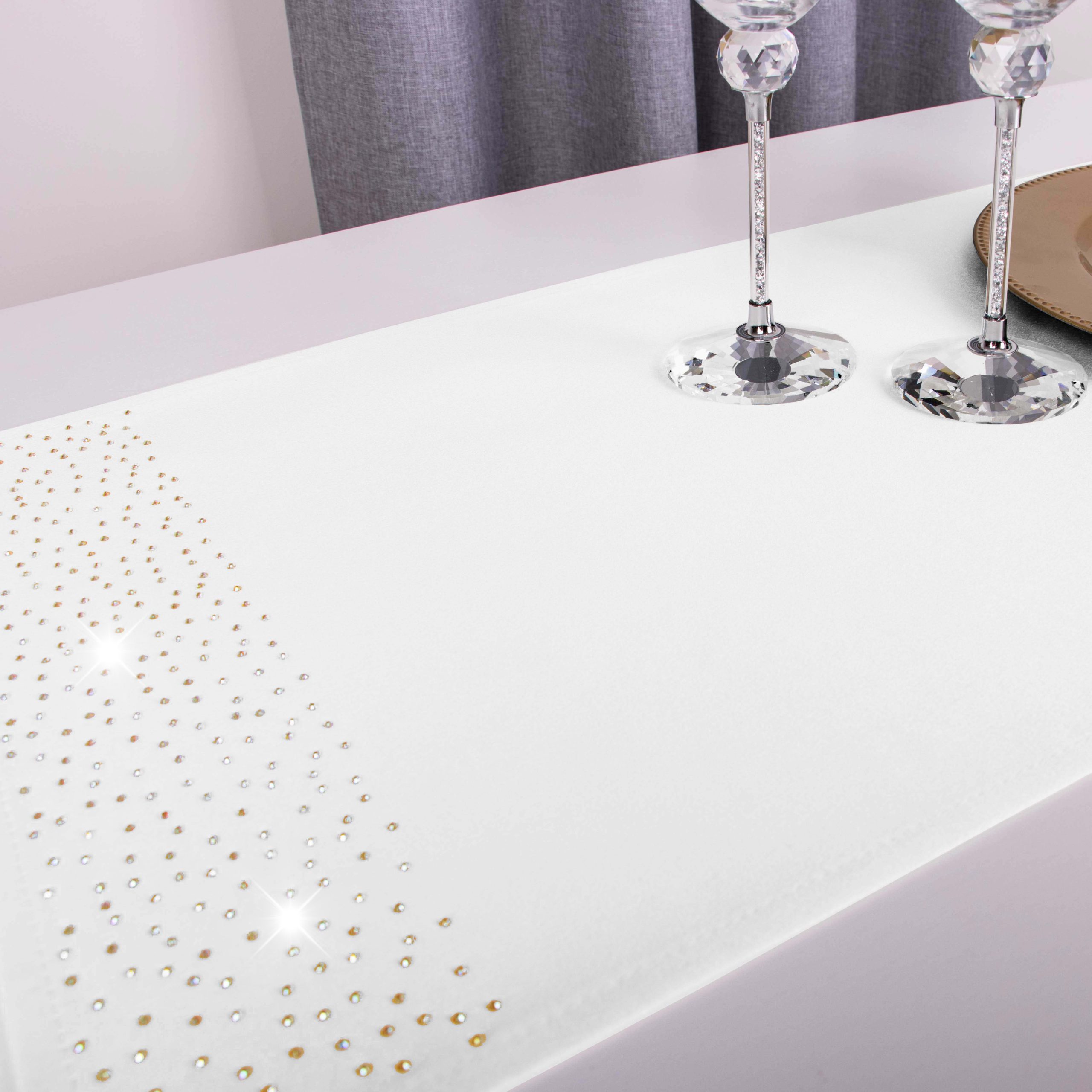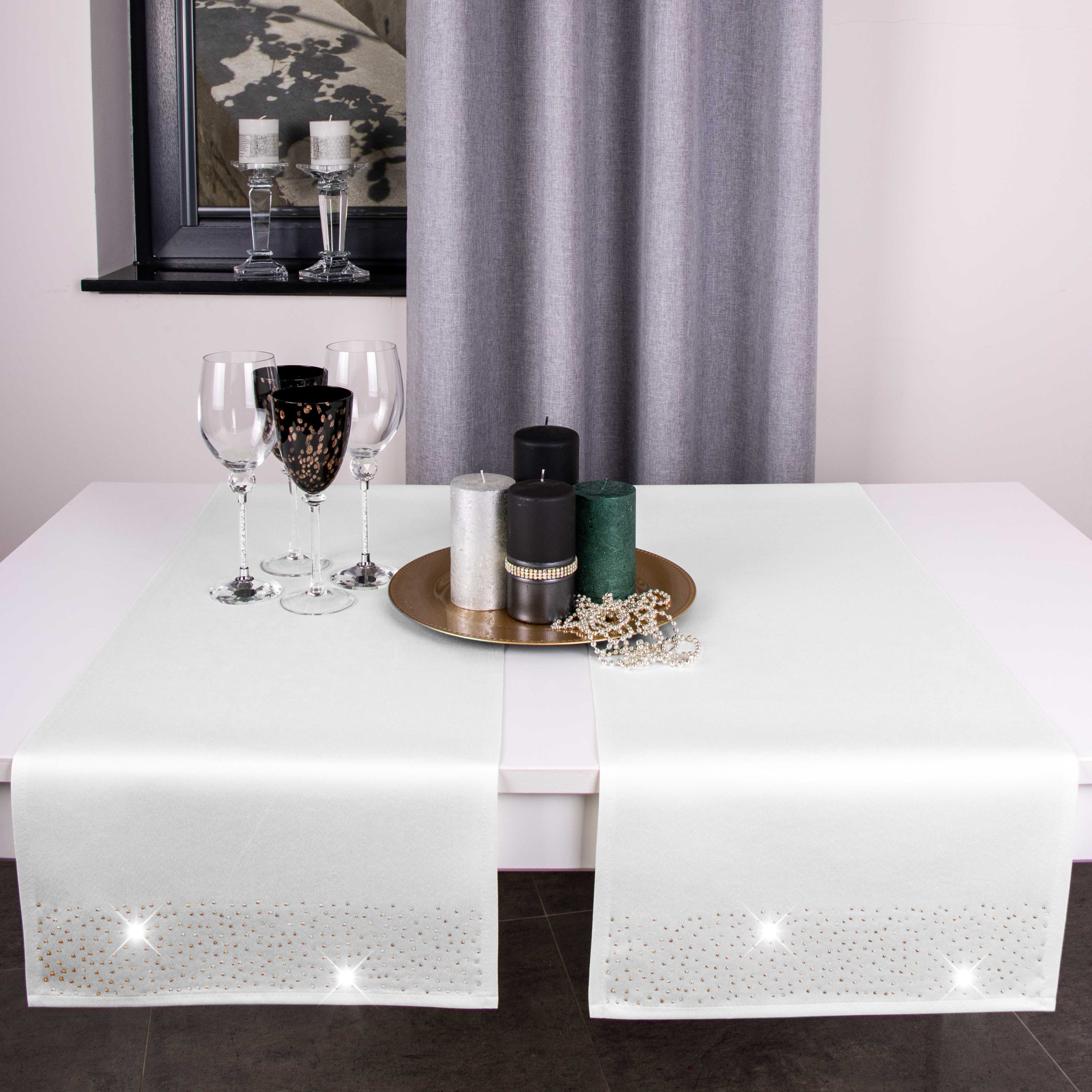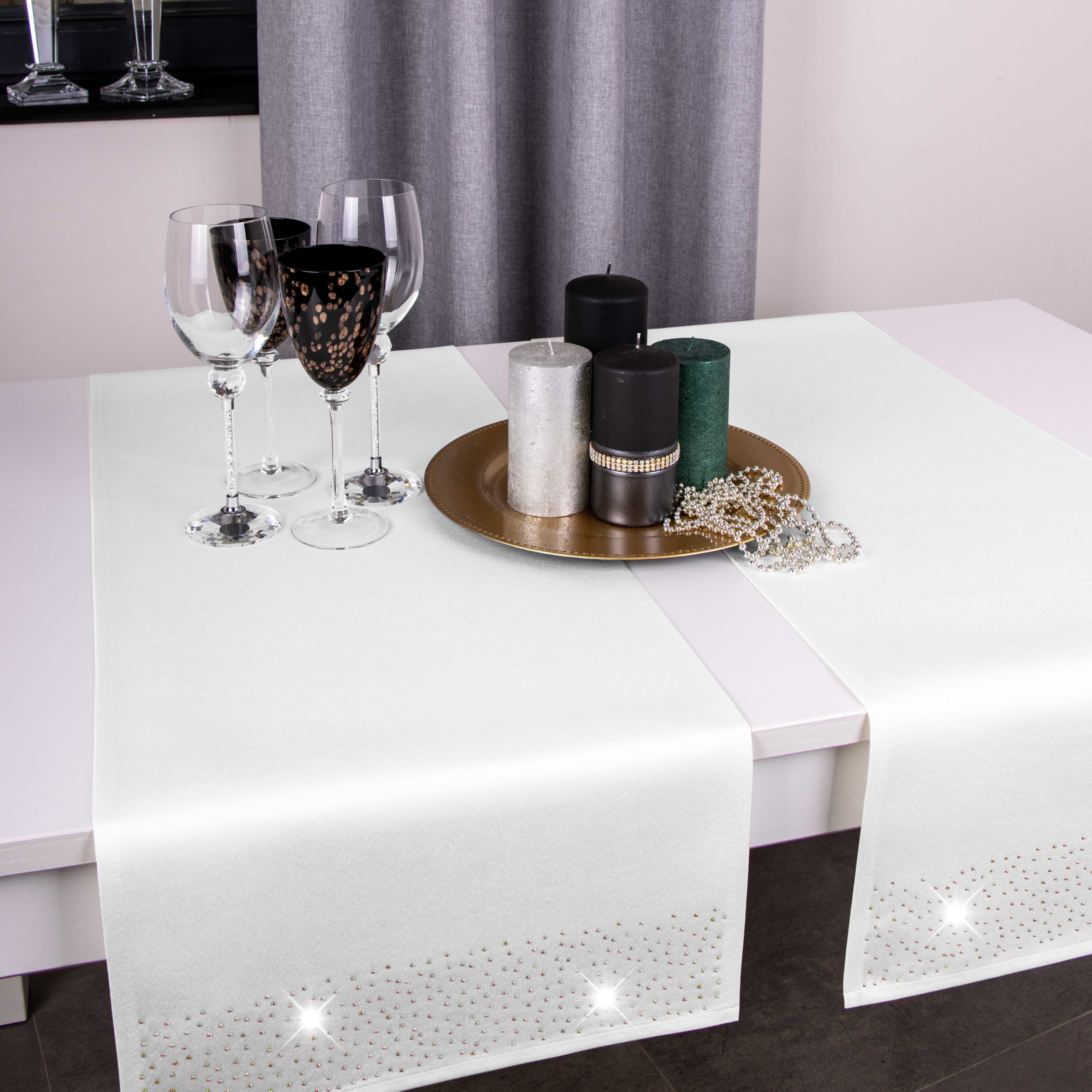 Pasy doskonale pasują do większości salonów i jadalni, ale znajdą również zastosowanie w restauracjach, hotelach oraz kafejkach. Ich niepowtarzalny wygląd idealnie komponuje się z kontrastującymi dodatkami takimi jak zastawa stołowa, sztućce czy świeczniki. Pasy zdobione są na obu końcach kryształkami.