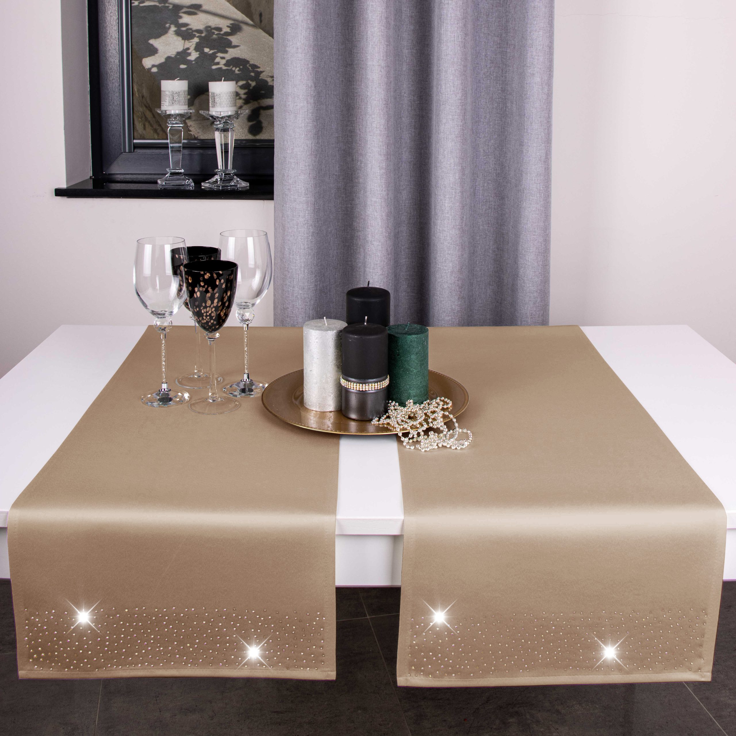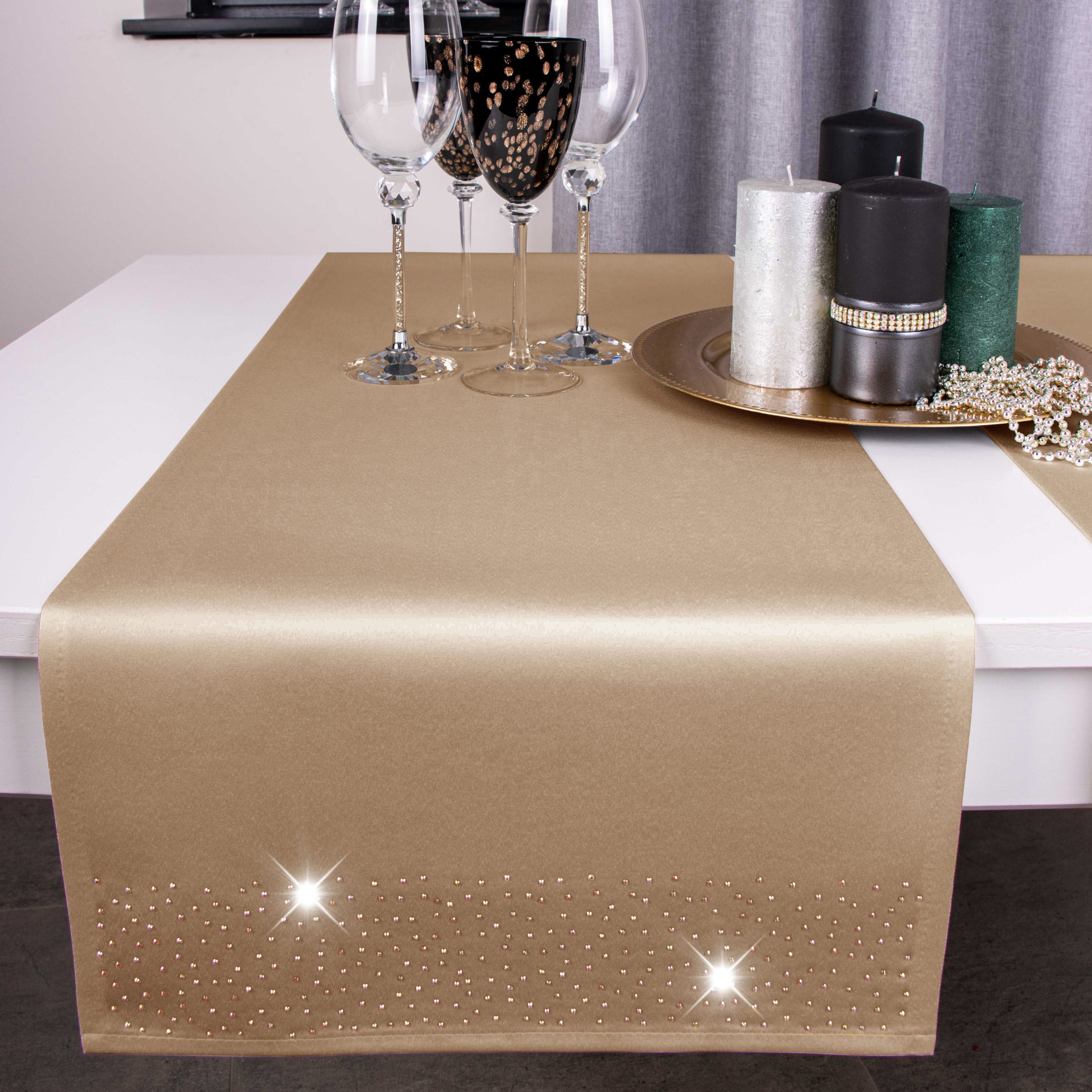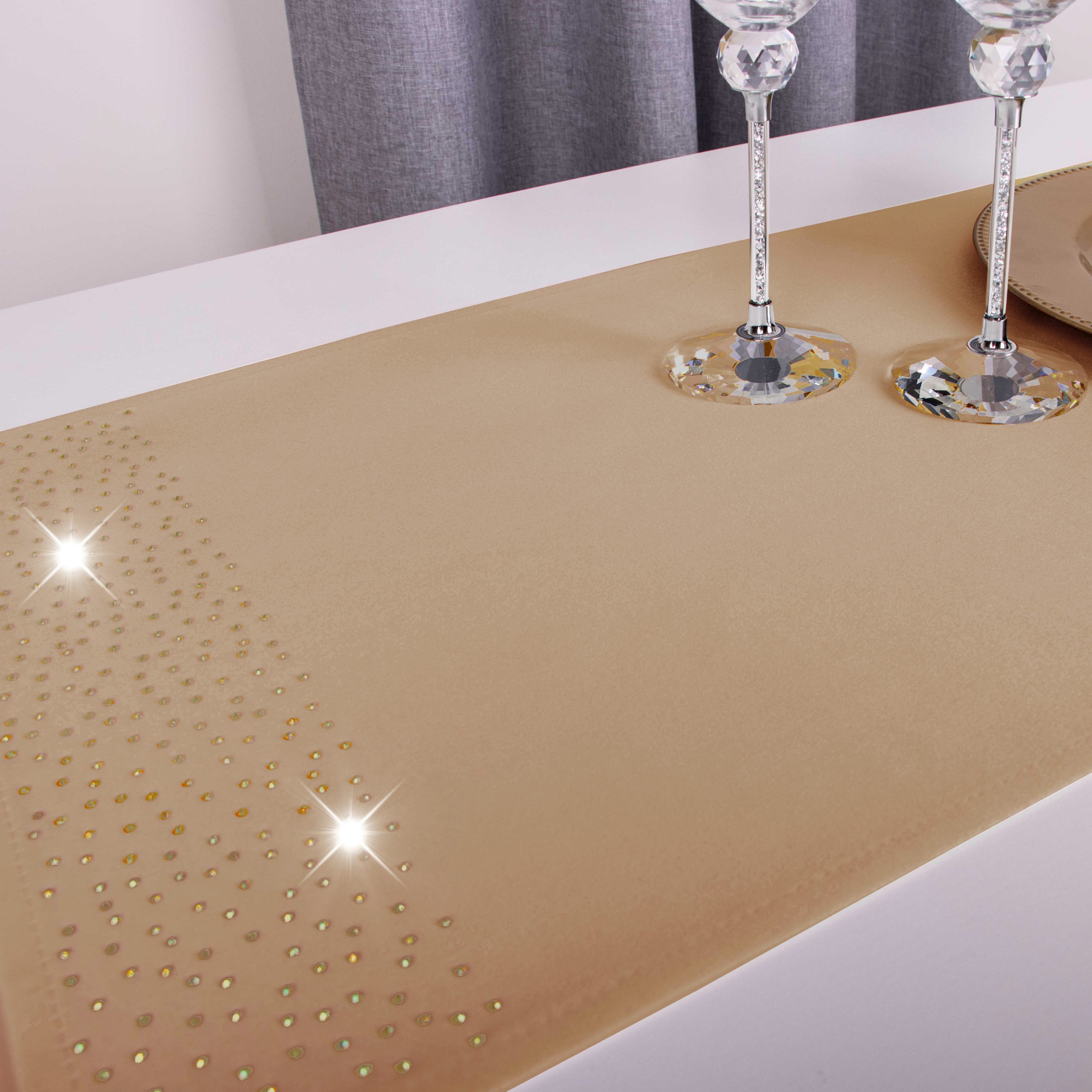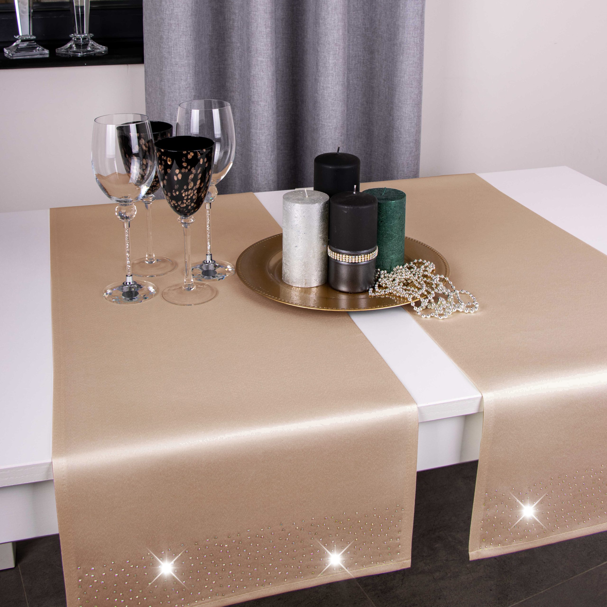 Pasy doskonale pasują do większości salonów i jadalni, ale znajdą również zastosowanie w restauracjach, hotelach oraz kafejkach. Ich niepowtarzalny wygląd idealnie komponuje się z kontrastującymi dodatkami takimi jak zastawa stołowa, sztućce czy świeczniki. Pasy zdobione są na obu końcach kryształkami.