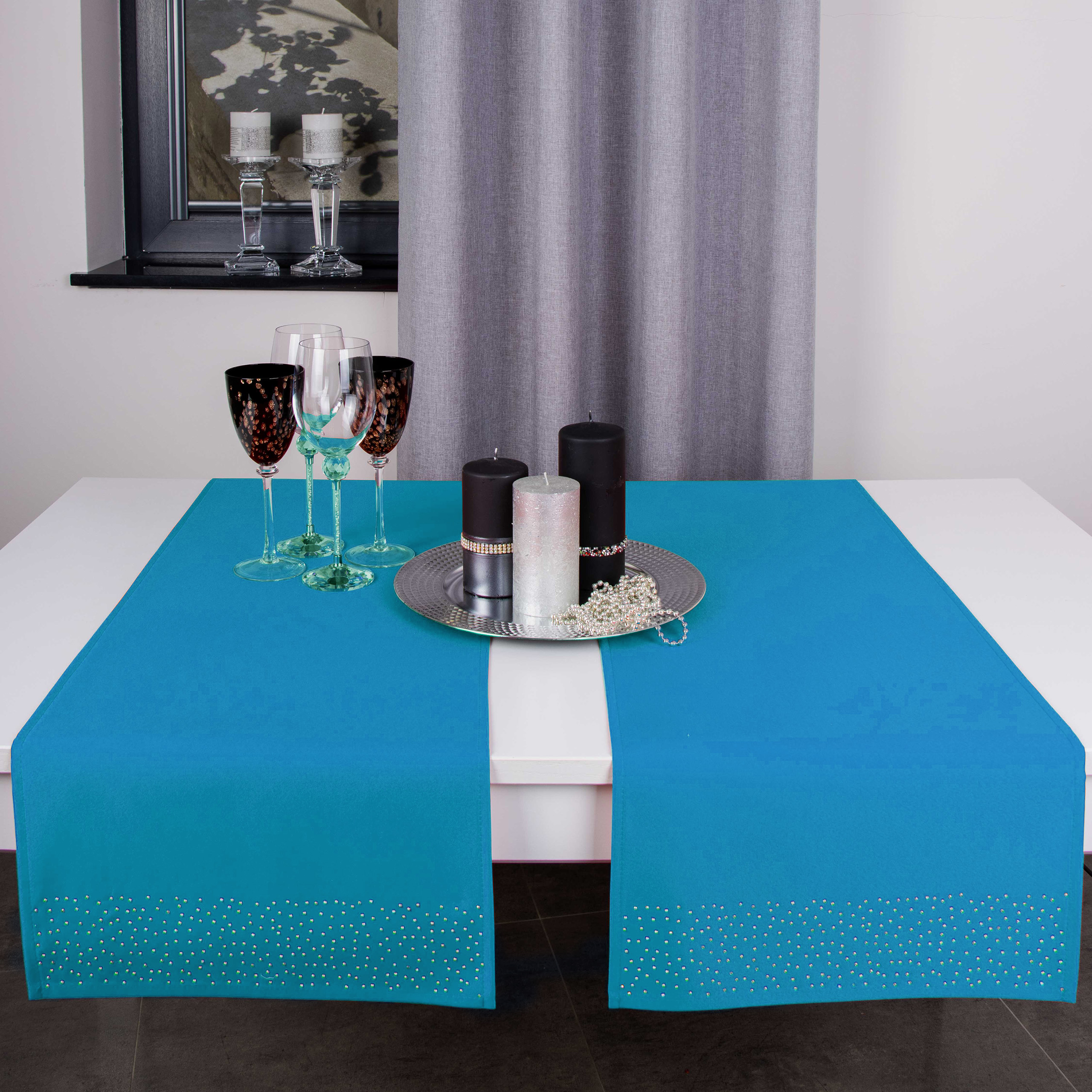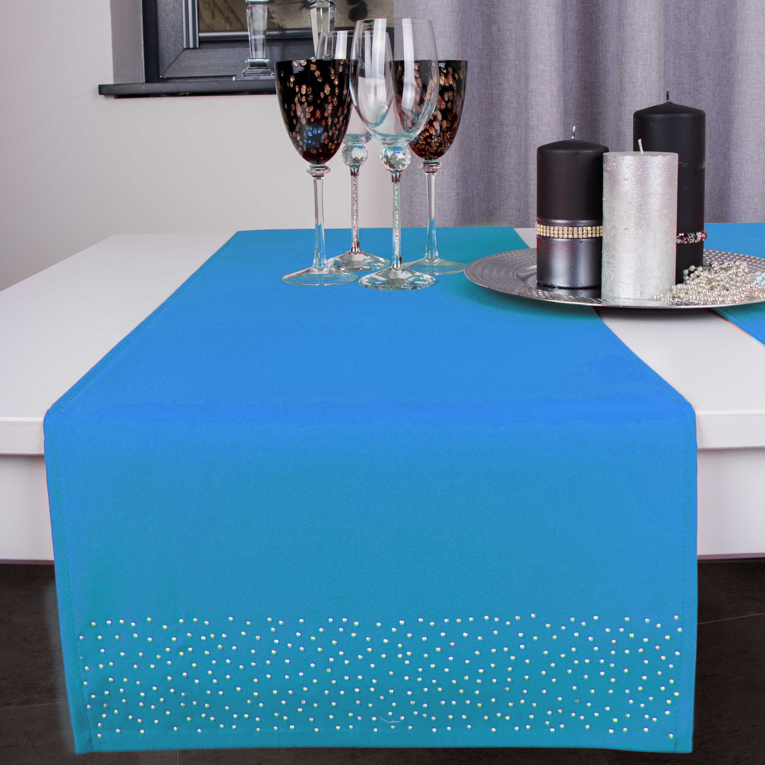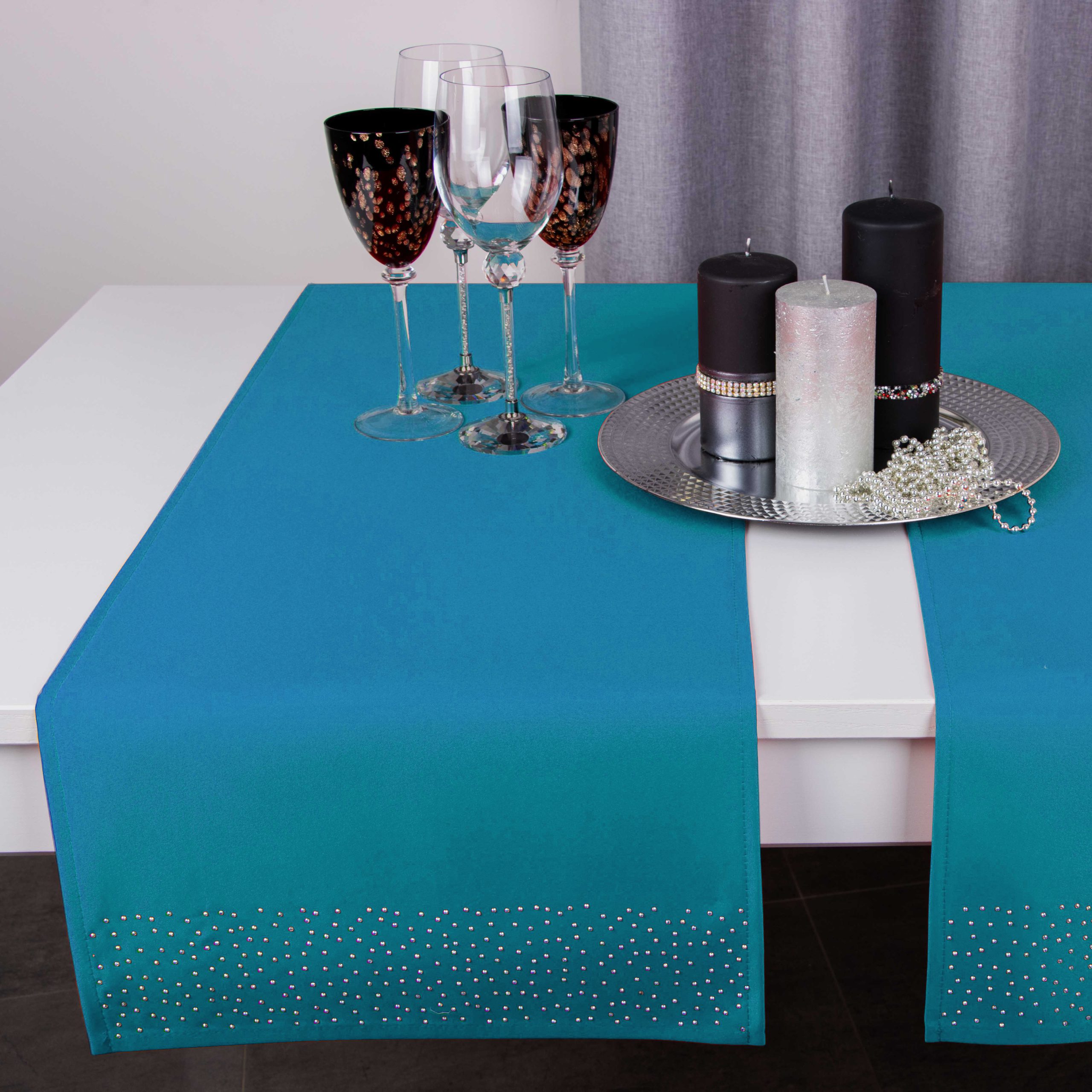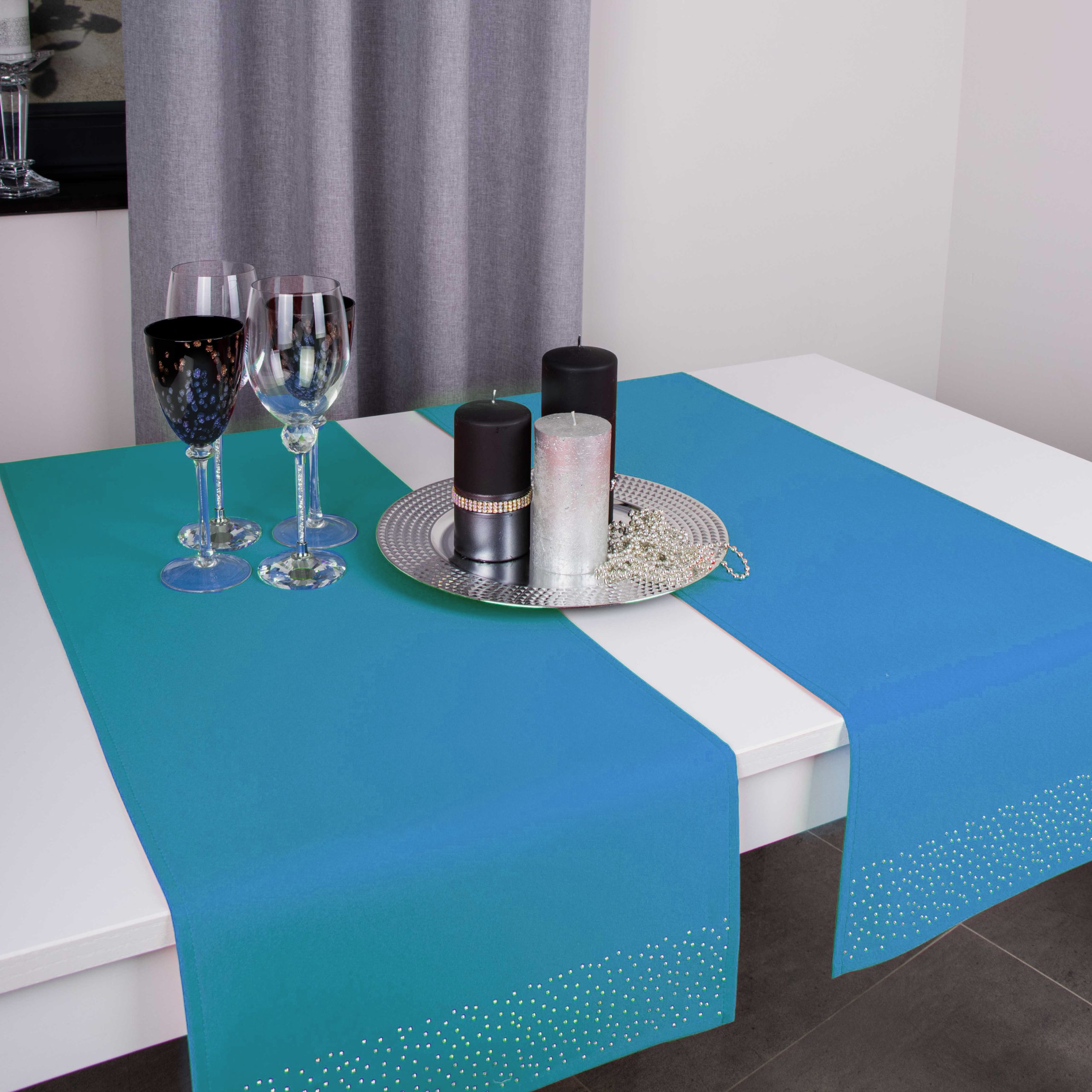 Pasy doskonale pasują do większości salonów i jadalni, ale znajdą również zastosowanie w restauracjach, hotelach oraz kafejkach. Ich niepowtarzalny wygląd idealnie komponuje się z kontrastującymi dodatkami takimi jak zastawa stołowa, sztućce czy świeczniki. Pasy zdobione są na obu końcach kryształkami.