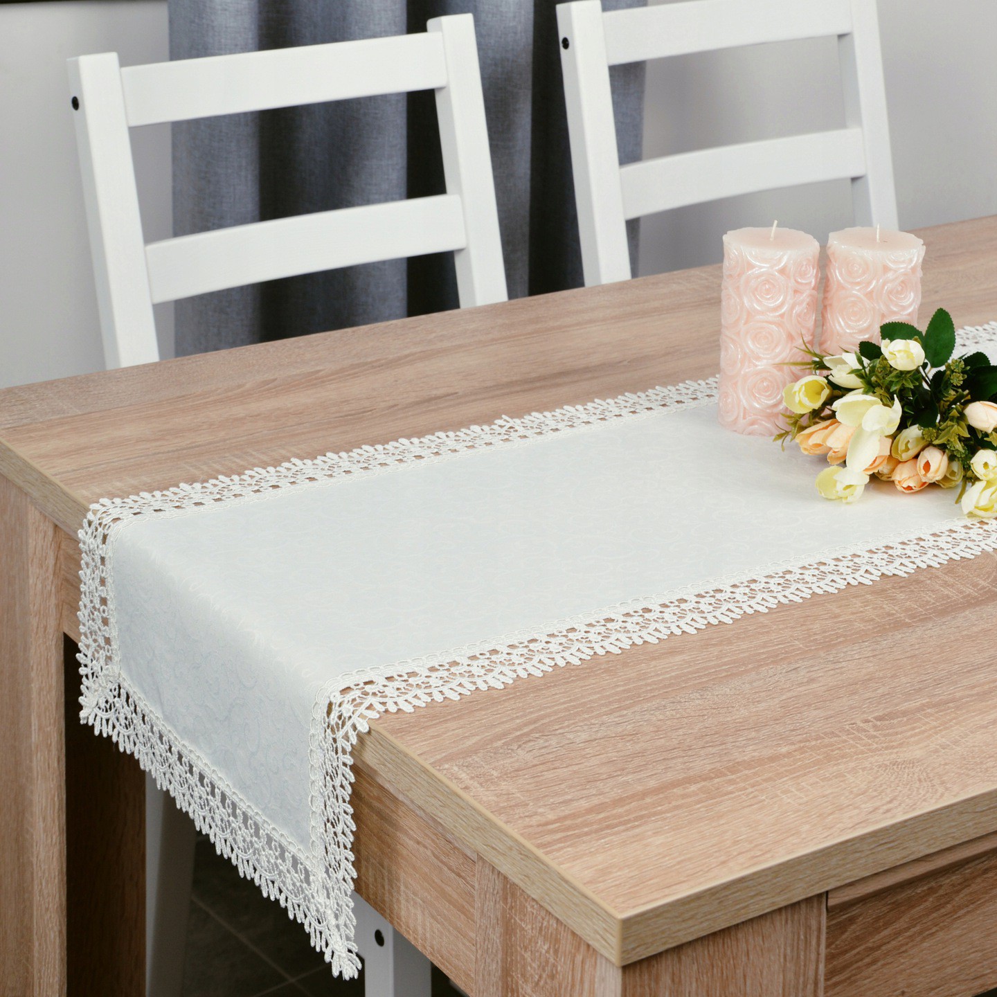 FLORENCJA to wyjątkowa kolekcja żakardowych bieżników wykończonych ozdobną gipiurą o szerokości 5 cm. Dekoracyjna gipiura nadaje bieżnikom eleganckiego sznytu oraz wyjątkowej aury. Dostępne są w trzech kolorach oraz w wielu rozmiarach, dlatego dopasowanie nie będzie stanowiło problemu. Bieżniki nadają wyjątkowego charakteru wnętrzom zarówno modernistycznym, skandynawskim, jak i klasycznym. Doskonale pasuje do większości salonów, jadalni, ale sprawdzi się również w ogrodzie podczas grilla, barbecue, czy innych ważnych uroczystości. Jego nienarzucający wygląd idealnie komponuje się z kontrastującymi dodatkami takimi jak świeczniki, zastawa stołowa czy sztućce.