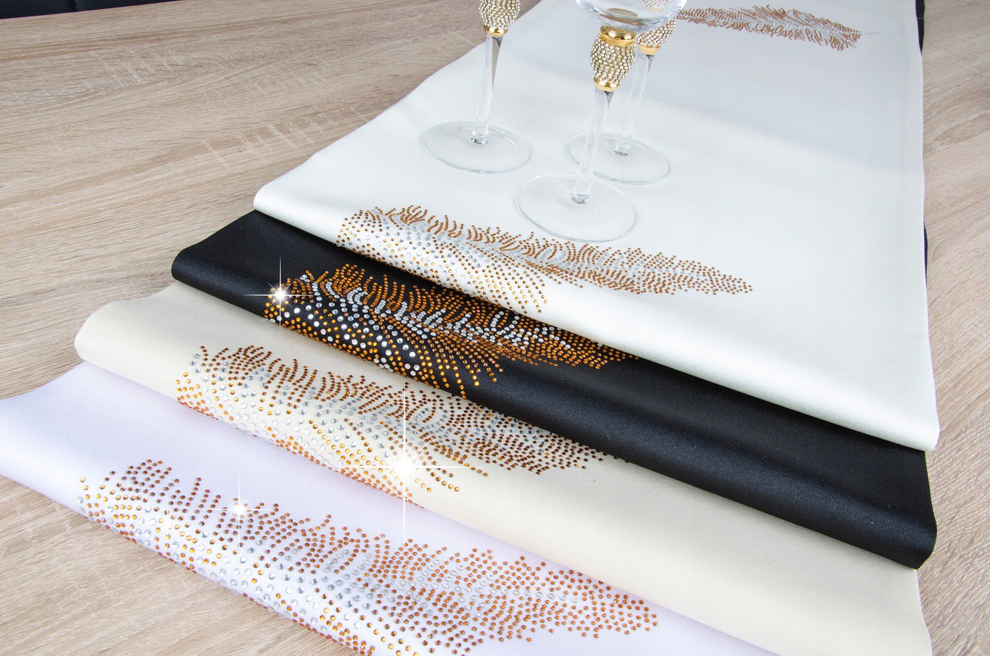 LIŚĆ to wyjątkowa kolekcja atłasowych bieżników wykonanych z podwójnie złożonego materiału, na obu brzegach ozdobione są nowoczesnym wzorem wykonanym ze szklanych kryształków. Bieżniki dostępne są w wielu kolorach oraz rozmiarach, dlatego dopasowanie nie będzie stanowiło problemu. Z kolekcji LIŚĆ proponujemy również inne produkty, jak poszewki, czy podkładki dostępne na naszych aukcjach.