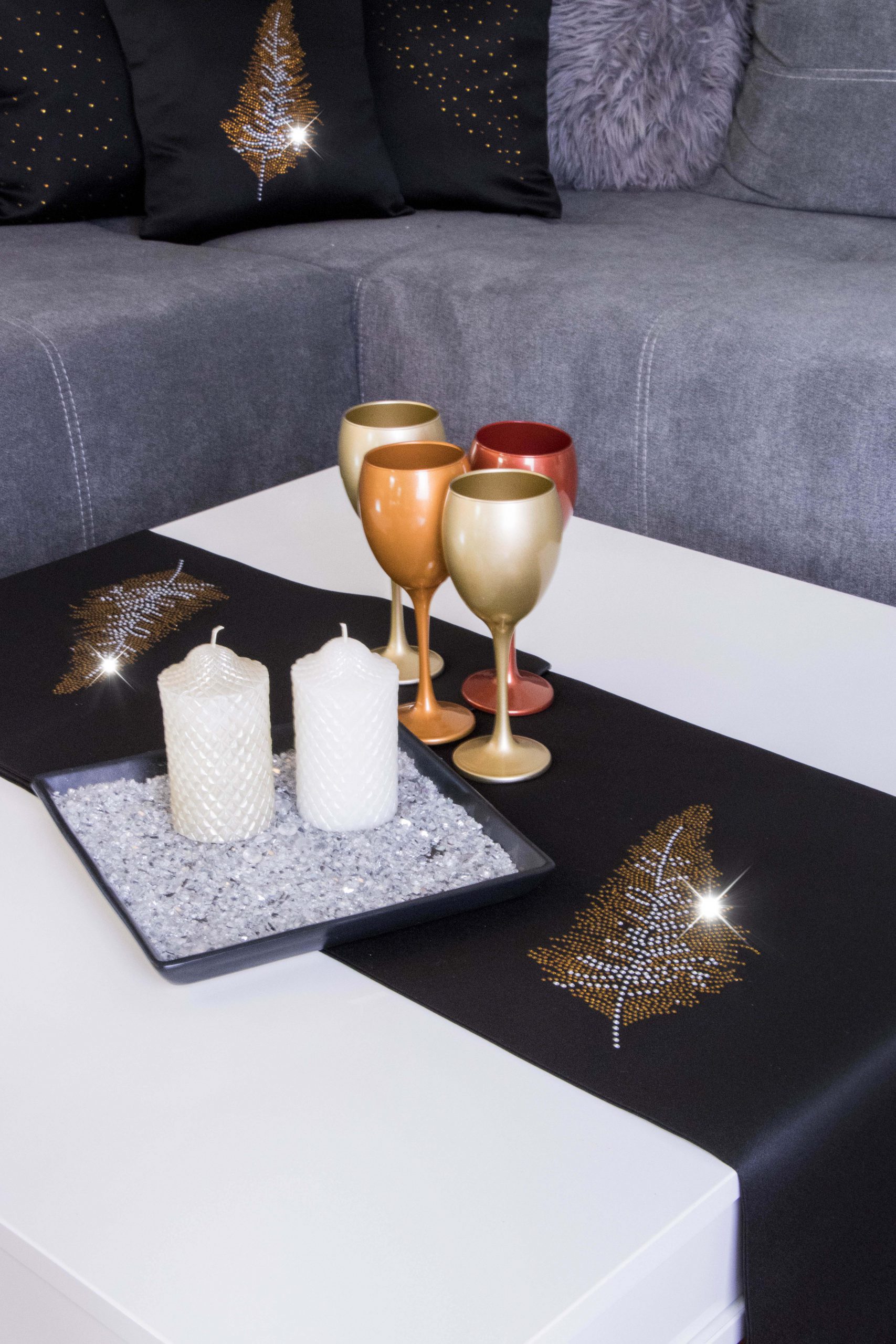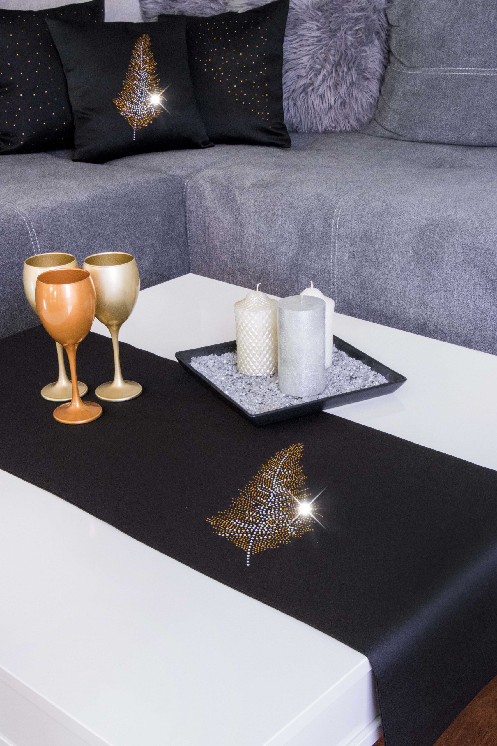 LIŚĆ to wyjątkowa kolekcja atłasowych bieżników wykonanych z podwójnie złożonego materiału, na obu brzegach ozdobione są nowoczesnym wzorem wykonanym ze szklanych kryształków. Bieżniki dostępne są w wielu kolorach oraz rozmiarach, dlatego dopasowanie nie będzie stanowiło problemu. Z kolekcji LIŚĆ proponujemy również inne produkty, jak poszewki, czy podkładki dostępne na naszych aukcjach.
