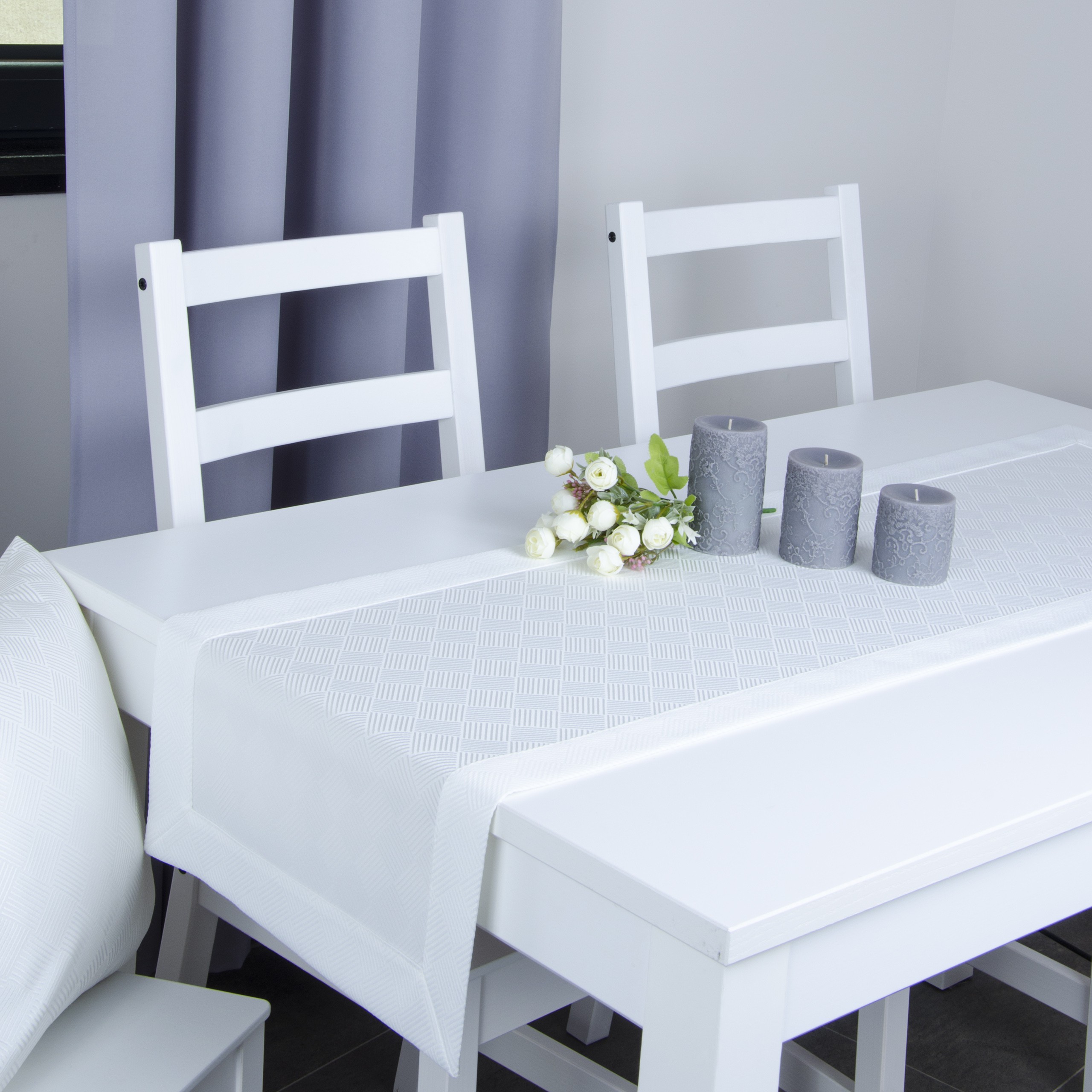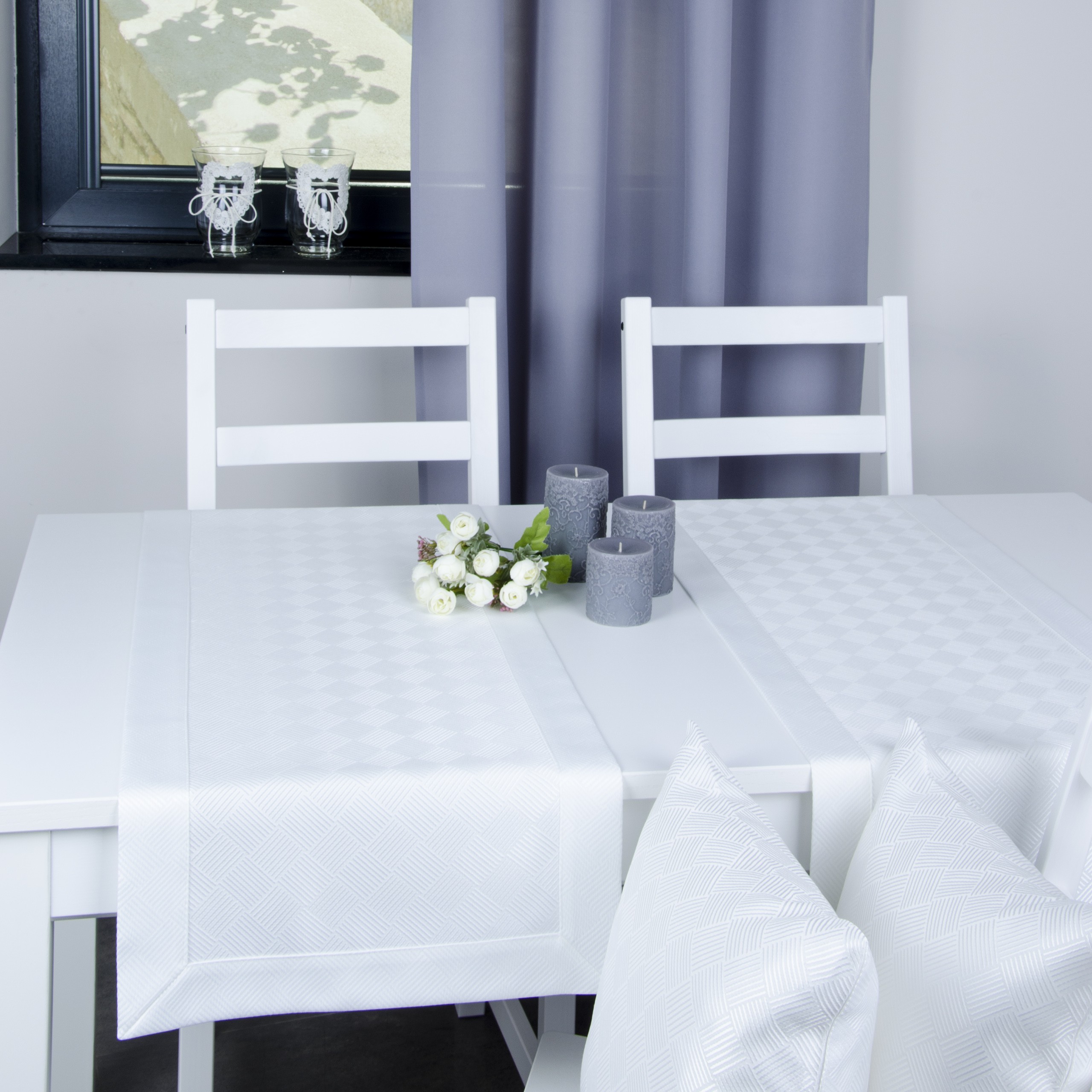 MERIDA – Pas z kolekcji MERIDA to wyjątkowa dekoracja dla Twojego wnętrza. Wykonany jest z żakardowej tkaniny z dodatkiem błyszczącej nitki, wykończonej elegancką listwą o szerokości 5cm. Nadaje bardzo oryginalny wygląd, który komponuje się z kontrastowymi dodatkami takimi jak zastawa stołowa, sztućce czy świeczniki. Jest łatwy w utrzymaniu, jego piękne, pastelowe kolory nie tracą swojej barwy, a więc obrus zachowuje swoje walory przez długi czas użytkowania. Obrusy doskonale komponują się w klasycznych i nowoczesnych aranżacjach. Pasują do większości salonów, jadani, ogrodów.