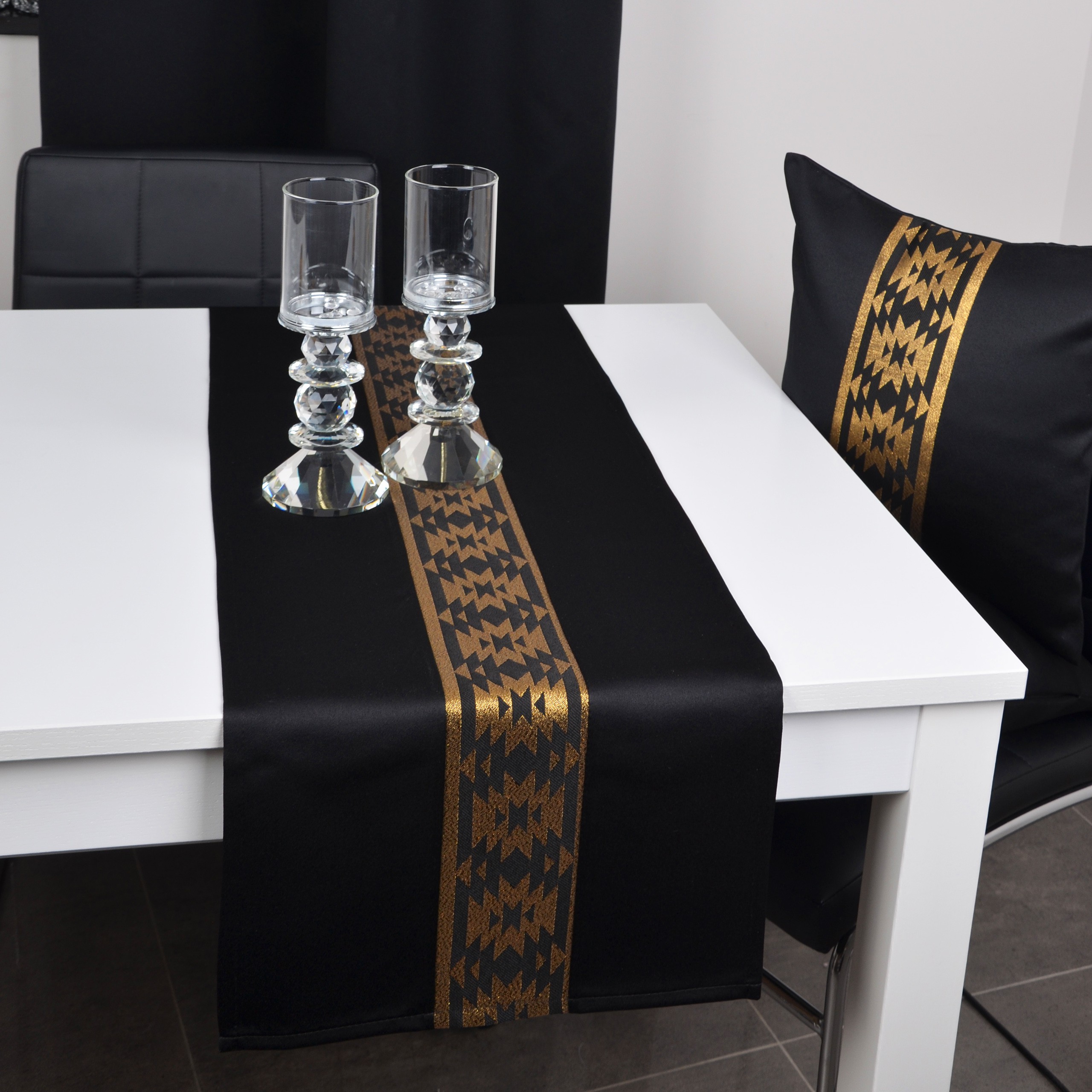VEGA LUX to wyjątkowa kolekcja atłasowych obrusów, bieżników i pasów wykończonych ozdobną listwą o szerokości 10 cm, tkaną metalizowaną nitką w kolorze srebrnym lub złotym z oryginalnym wzorem azteckim.