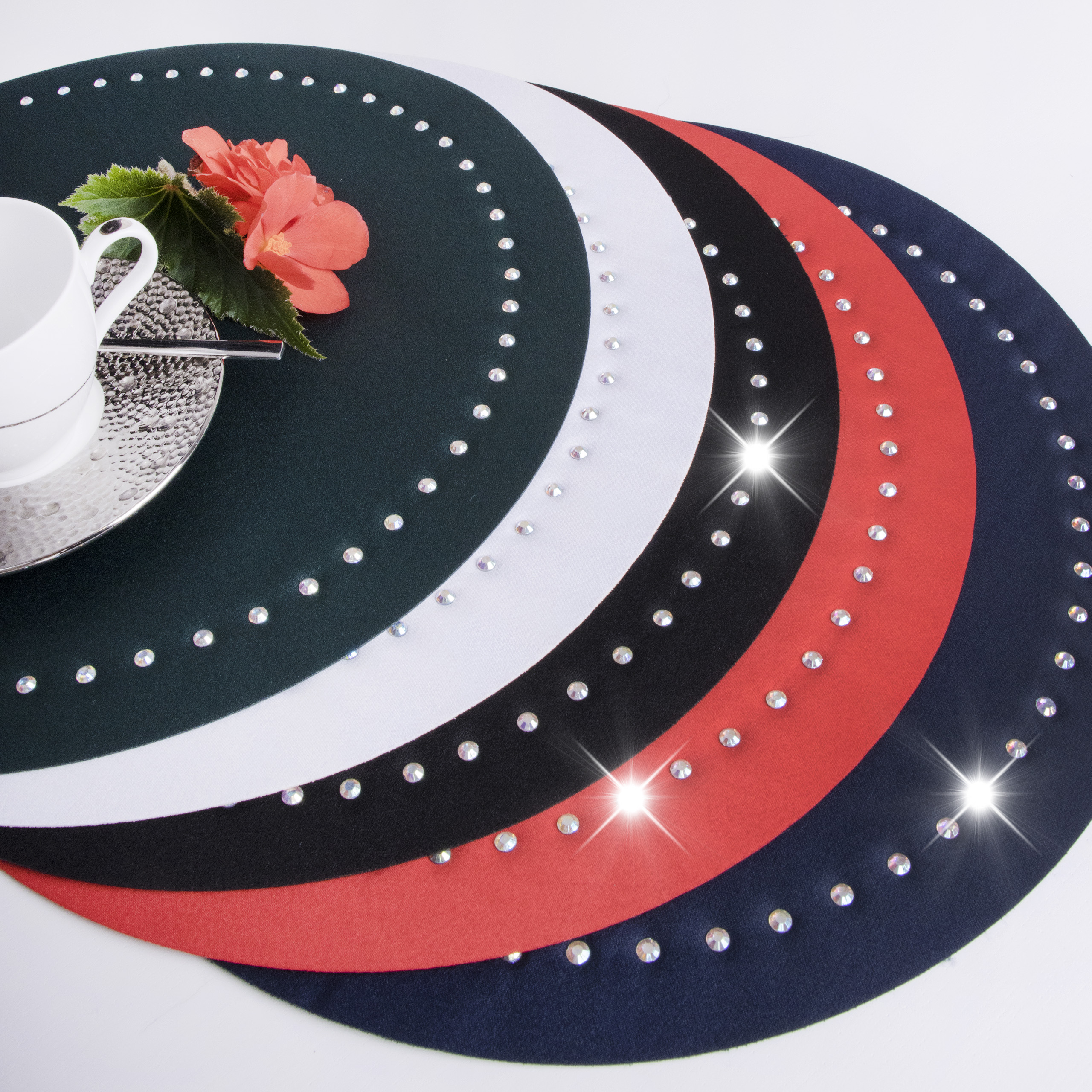 GLAMOUR to wyjątkowa kolekcja atłasowych podkładek wykonanych z dwóch warstw wysokogatunkowej tkaniny poliestrowej, sklejonej i usztywnionej od środka. Podkładki są ozdobione wokół srebrnymi cyrkoniami, co dodaje im eleganckiego wyglądu. Dostępne są w wielu kolorach, dlatego dopasowanie nie będzie stanowić problemu.