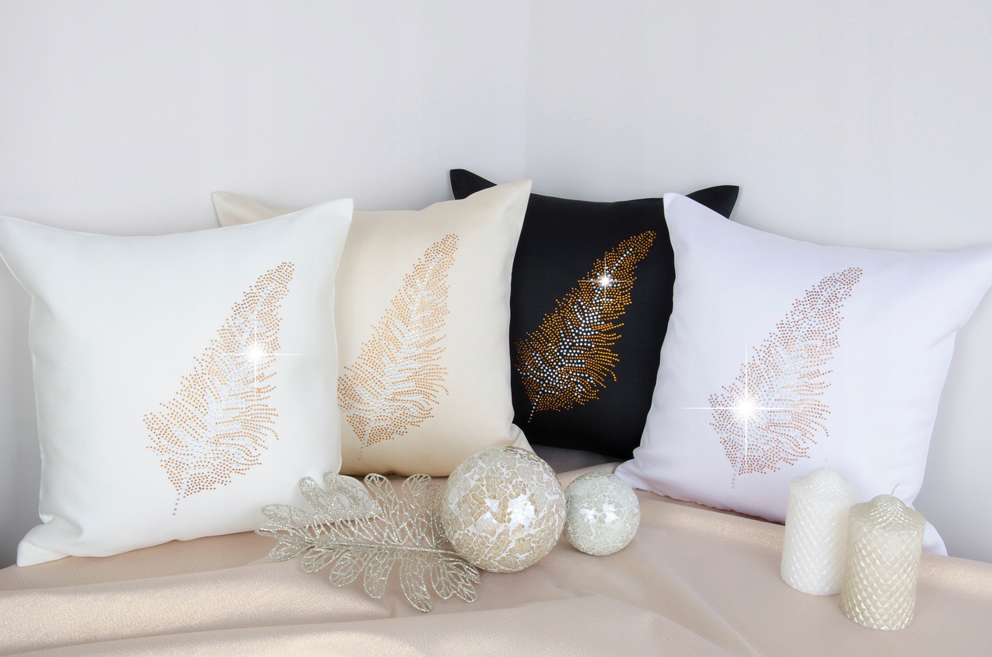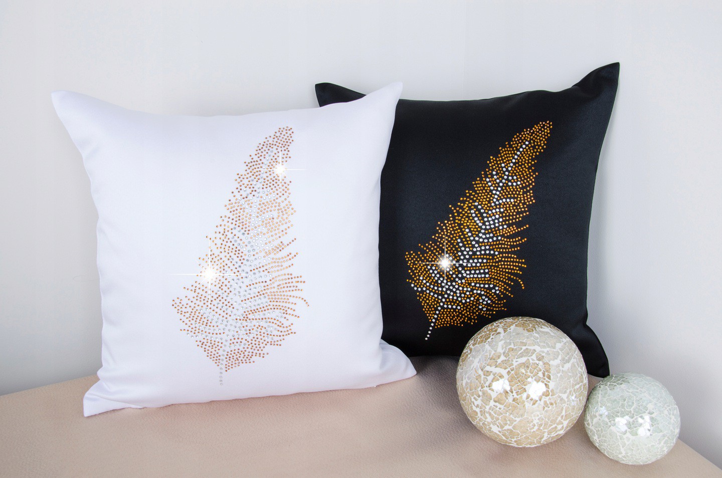 POSZEWKA LIŚĆ – Eleganckie poszewki dekoracyjne wykonane są z wysokogatunkowej tkaniny poliestrowej o splocie atłasowym. Poszewki wysadzane są złotymi dżetami, które podkreślają ich elegancki wygląd.