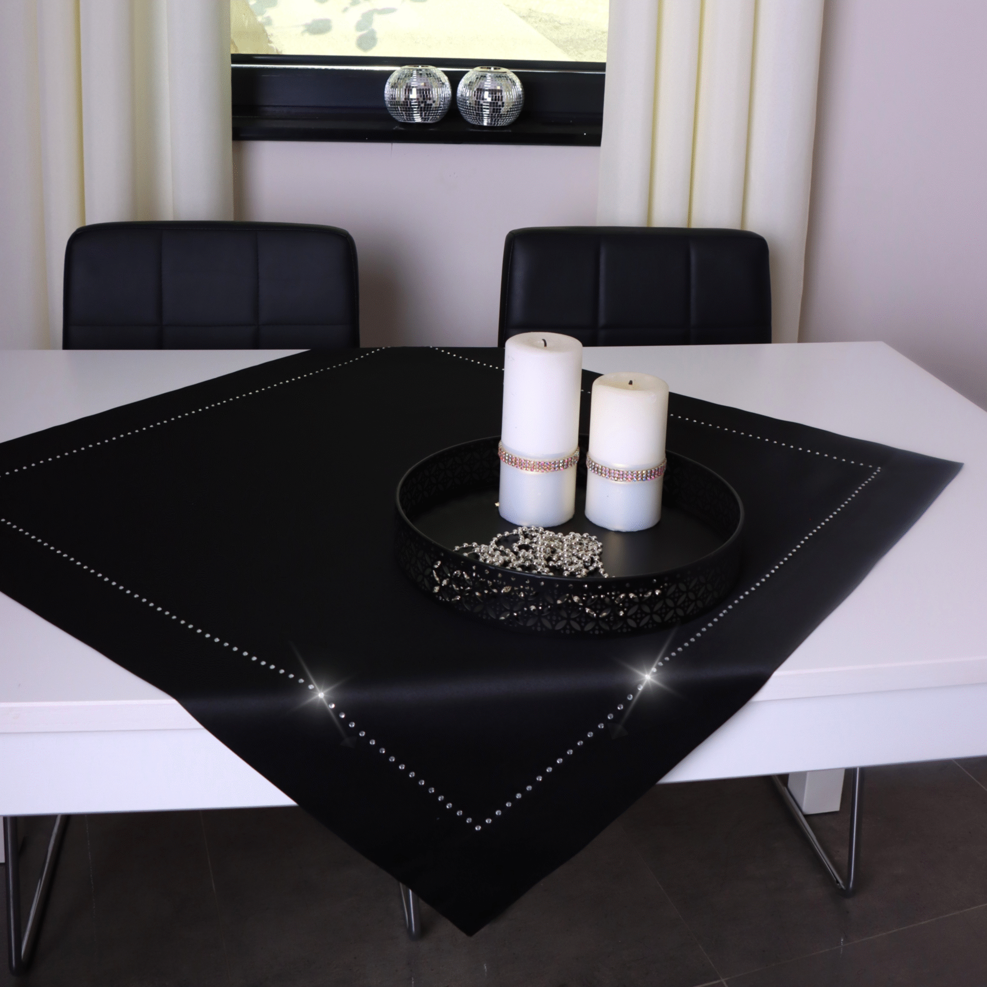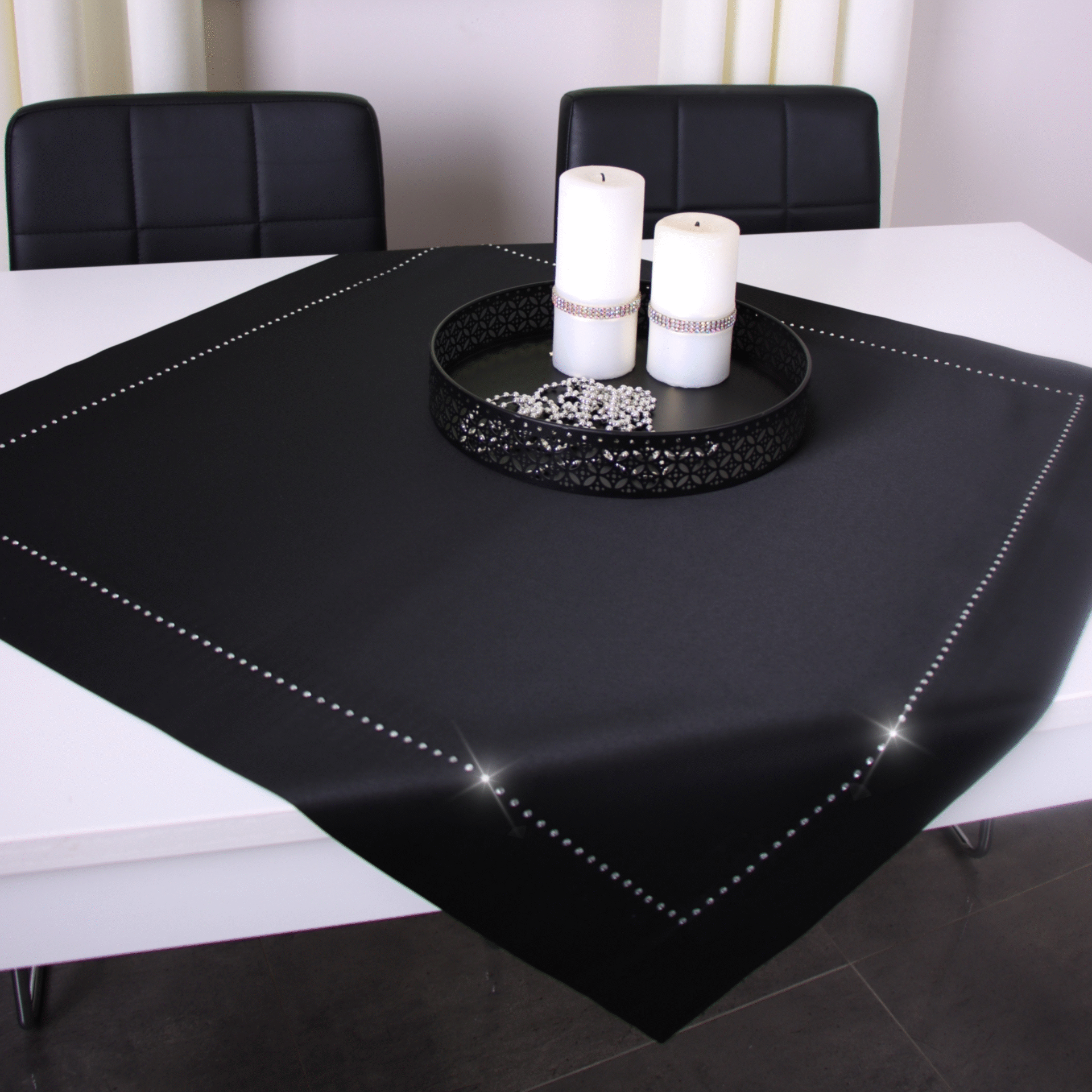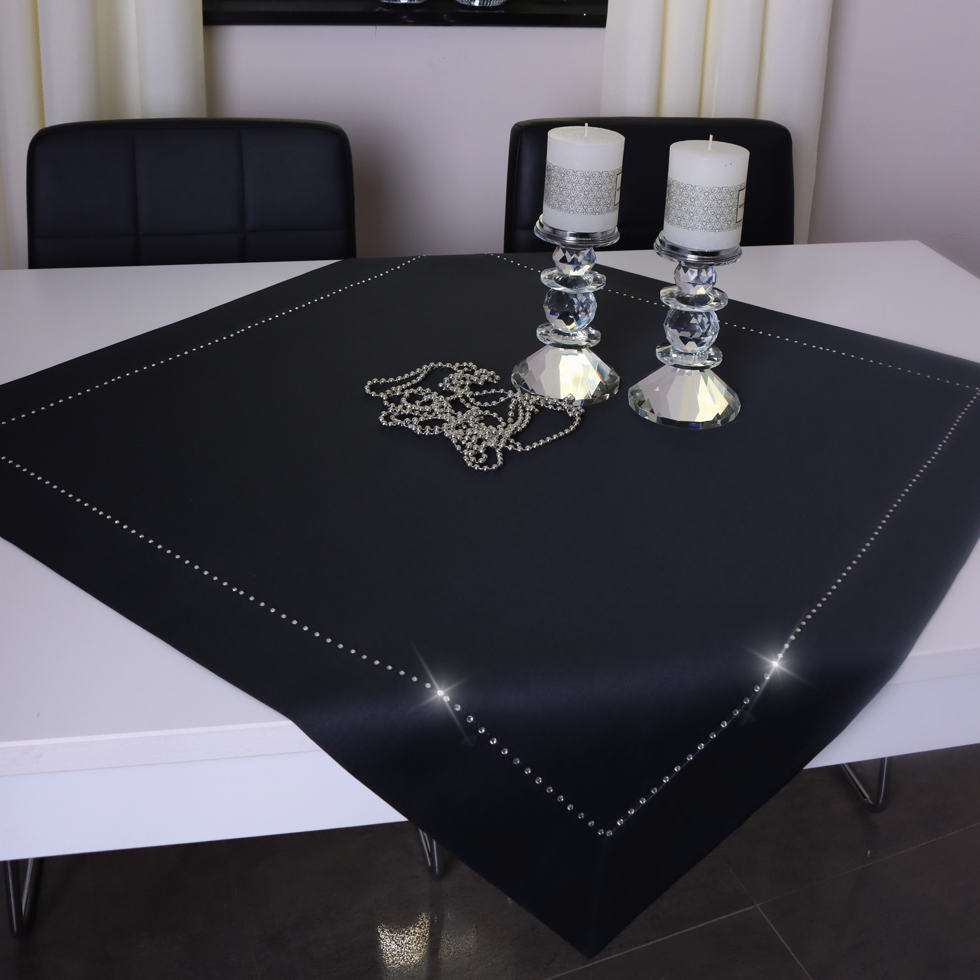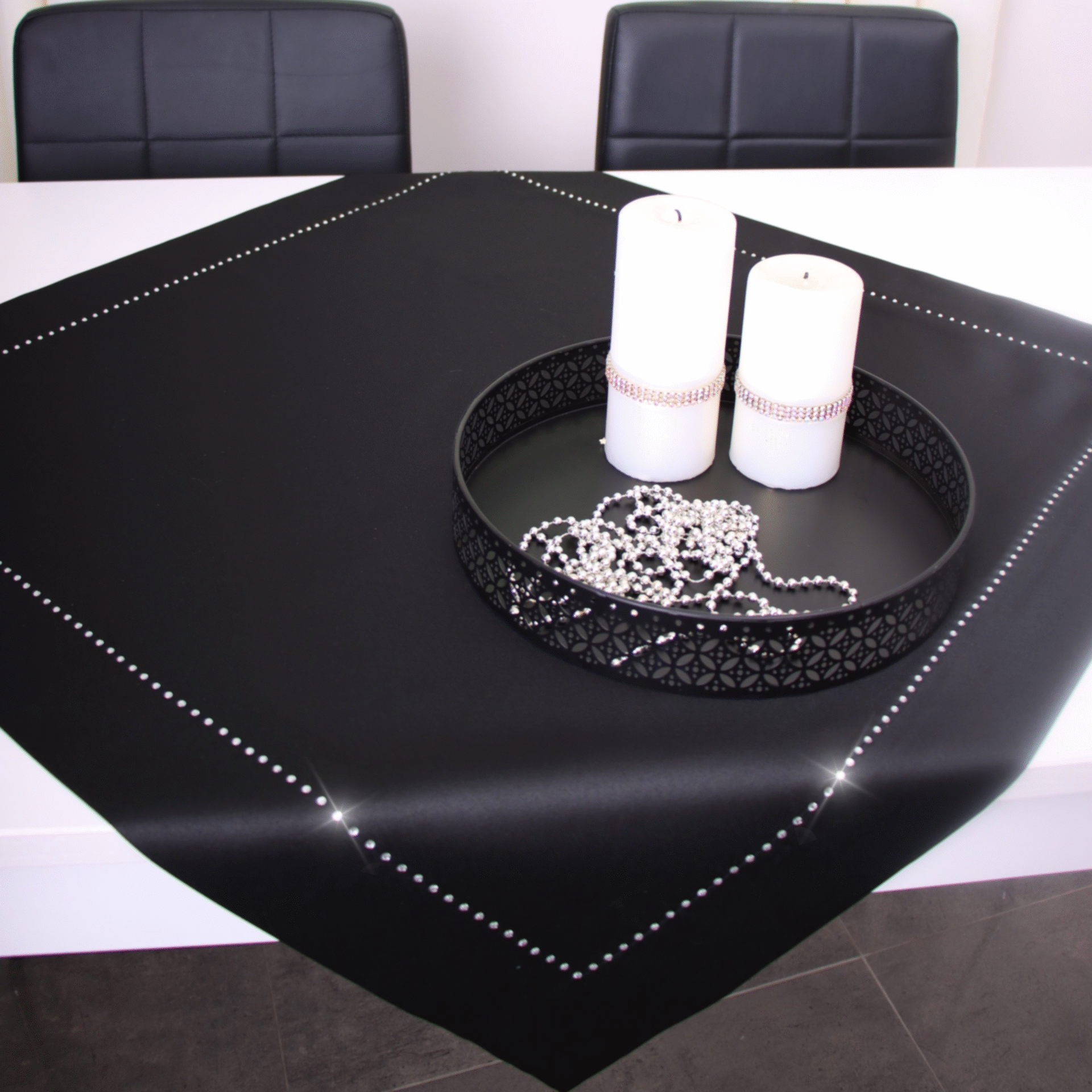 GLAMOUR to wyjątkowa kolekcja atłasowych obrusów wykończonych ozdobną listwą o szerokości 7 cm, wzdłuż obszycia ozdobione są nowoczesnym wzorem wykonanym z metalowych, srebrnych dżetów.
