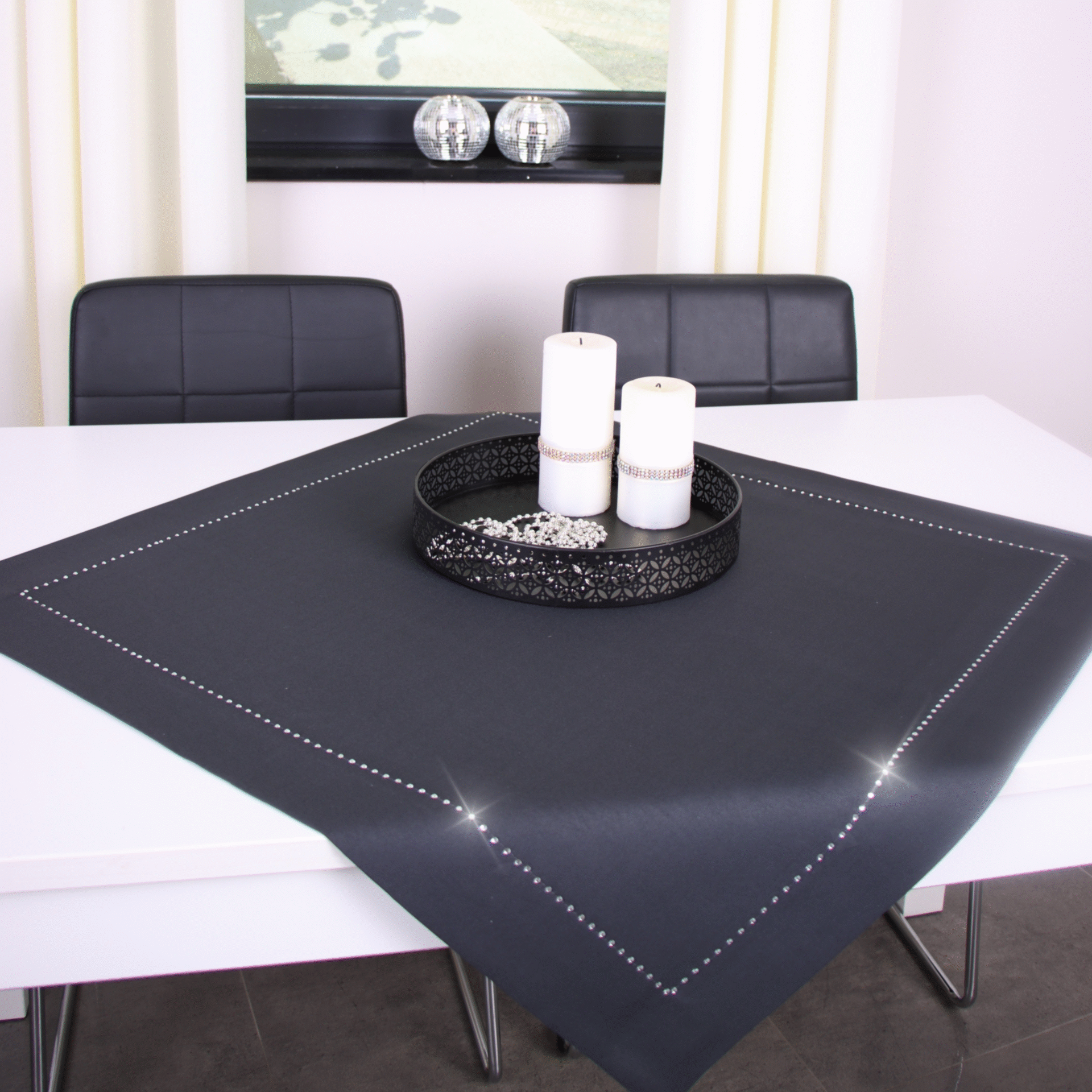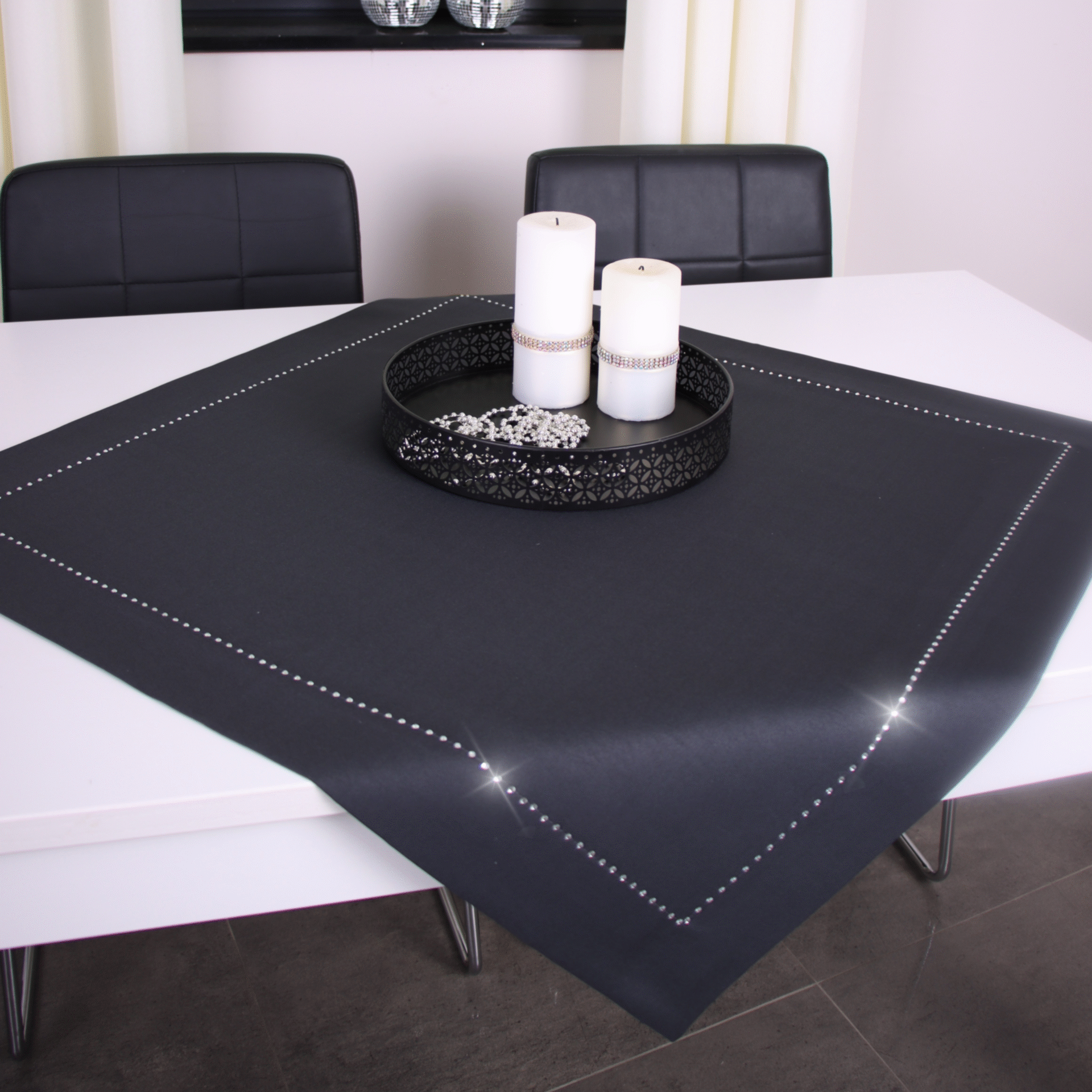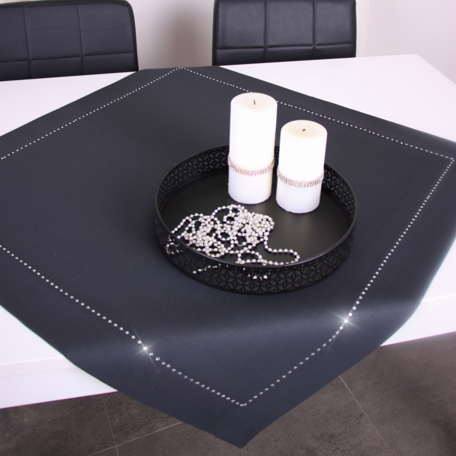 GLAMOUR to wyjątkowa kolekcja atłasowych obrusów wykończonych ozdobną listwą o szerokości 7 cm, wzdłuż obszycia ozdobione są nowoczesnym wzorem wykonanym z metalowych, srebrnych dżetów.